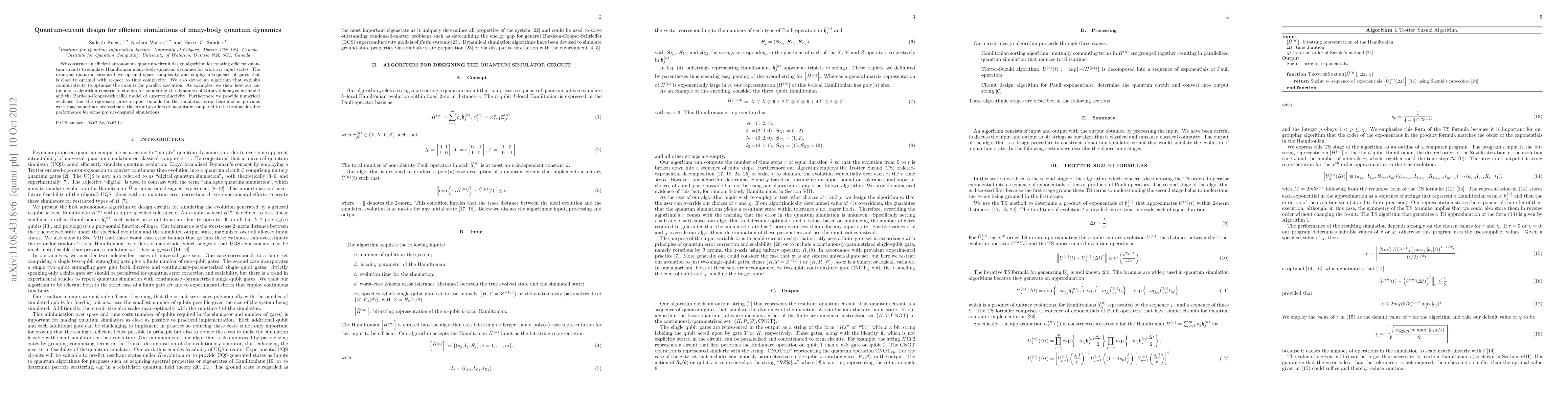 We construct an efficient autonomous quantum-circuit design algorithm for creating efficient quantum circuits to simulate Hamiltonian many-body quantum dynamics for arbitrary input states. The resultant quantum circuits have optimal space complexity and employ a sequence of gates that is close to optimal with respect to time complexity. We also devise an algorithm that exploits commutativity to optimize the circuits for parallel execution. As examples, we show how our autonomous algorithm constructs circuits for simulating the dynamics of Kitaev's honeycomb model and the Bardeen-Cooper-Schrieffer model of superconductivity. Furthermore we provide numerical evidence that the rigorously proven upper bounds for the simulation error here and in previous work may sometimes overestimate the error by orders of magnitude compared to the best achievable performance for some physics-inspired simulations.