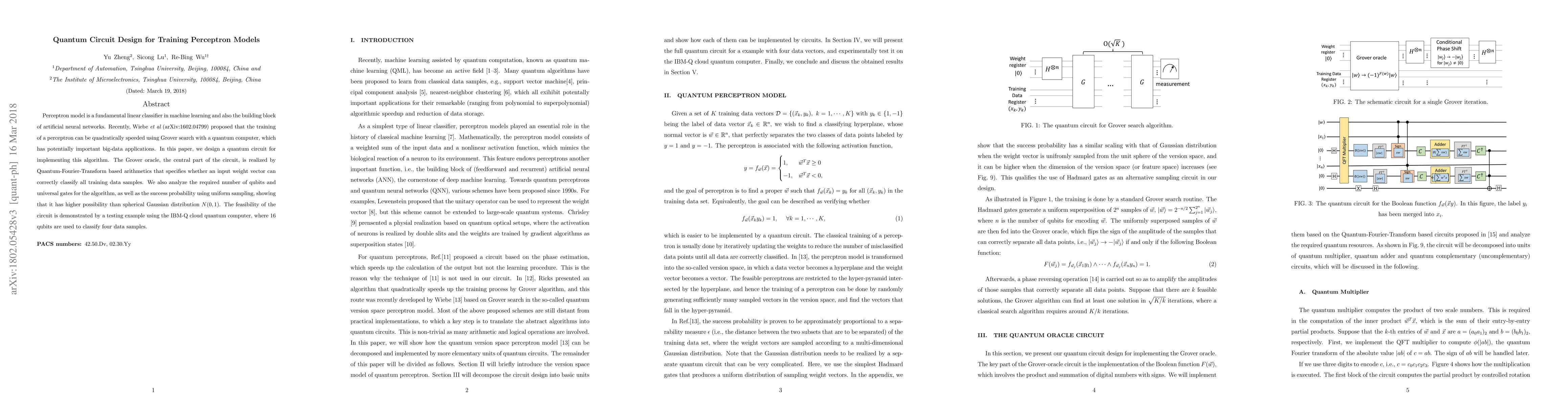 The paper presents a quantum circuit design for training perceptron models using Grover search algorithm, implemented with Quantum-Fourier-Transform based arithmetics.