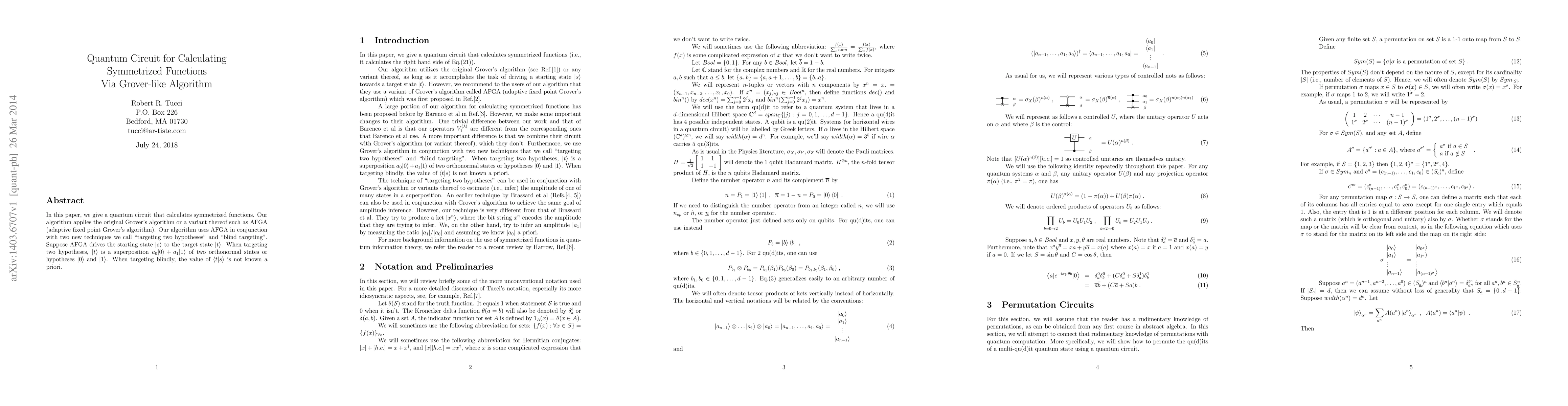 In this paper, we give a quantum circuit that calculates symmetrized functions. Our algorithm applies the original Grover's algorithm or a variant thereof such as AFGA (adaptive fixed point Grover's algorithm). Our algorithm uses AFGA in conjunction with two new techniques we call "targeting two hypotheses" and "blind targeting". Suppose AFGA drives the starting state $|s\rangle$ to the target state $|t\rangle$. When targeting two hypotheses, $|t\rangle$ is a superposition $a_0|0\rangle + a_1|1\rangle$ of two orthonormal states or hypotheses $|0\rangle$ and $|1\rangle$. When targeting blindly, the value of $\langle t| s\rangle$ is not known a priori.
