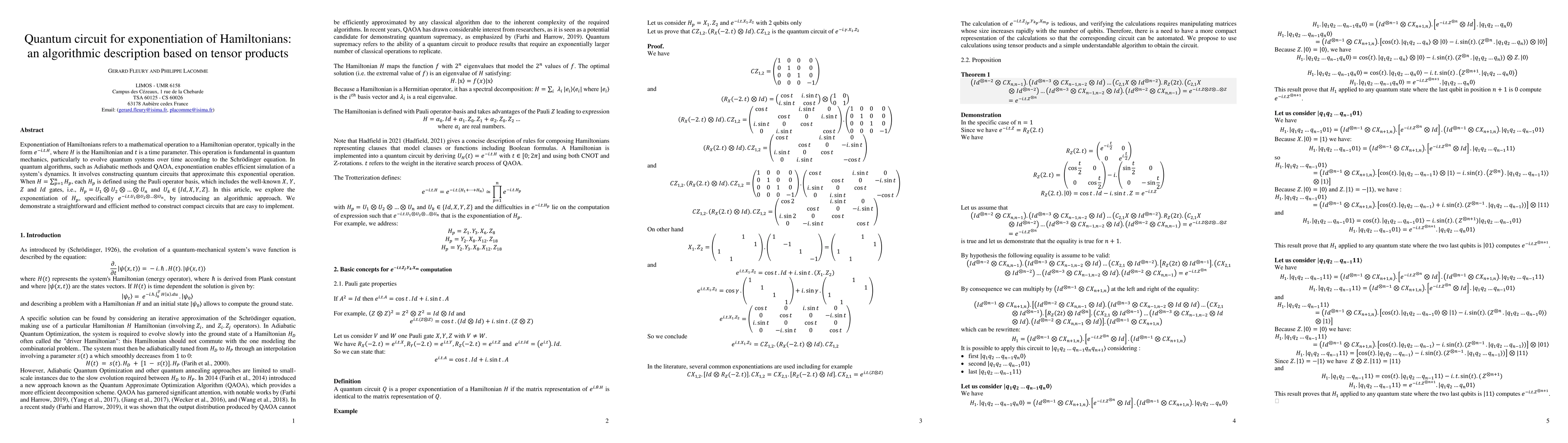 The paper presents an algorithmic approach to exponentiate Hamiltonians, specifically focusing on constructing compact quantum circuits for e^(-i.t.U_1 ⊗ U_2 ⊗ ... ⊗ U_n) using tensor products and Pauli operators.