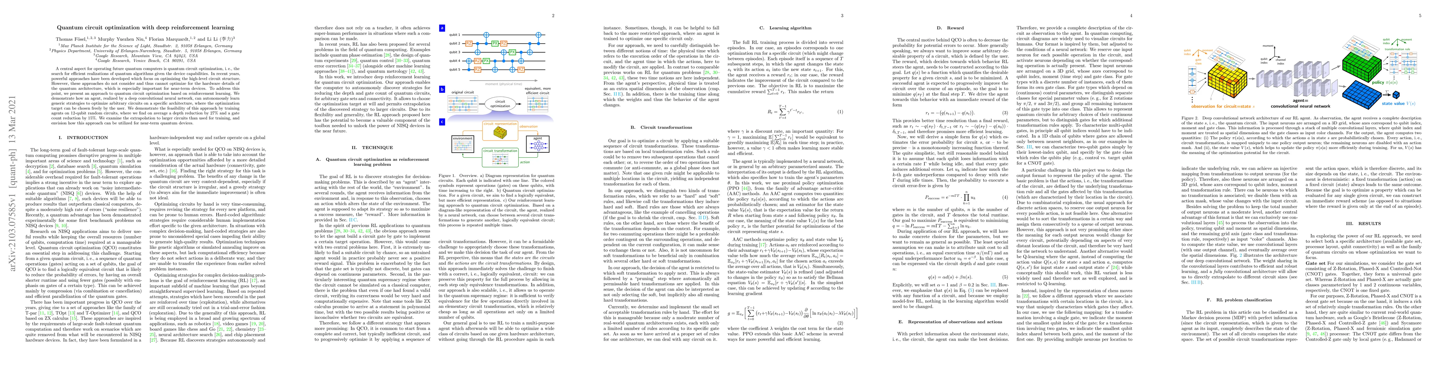 This research proposes a reinforcement learning-based method for optimizing quantum circuits tailored to specific hardware, demonstrating a deep convolutional neural network agent that autonomously reduces circuit depth and gate count by 27% and 15%, respectively, on 12-qubit random circuits. The approach shows promise for enhancing the efficiency of quantum algorithms on near-term quantum devices.