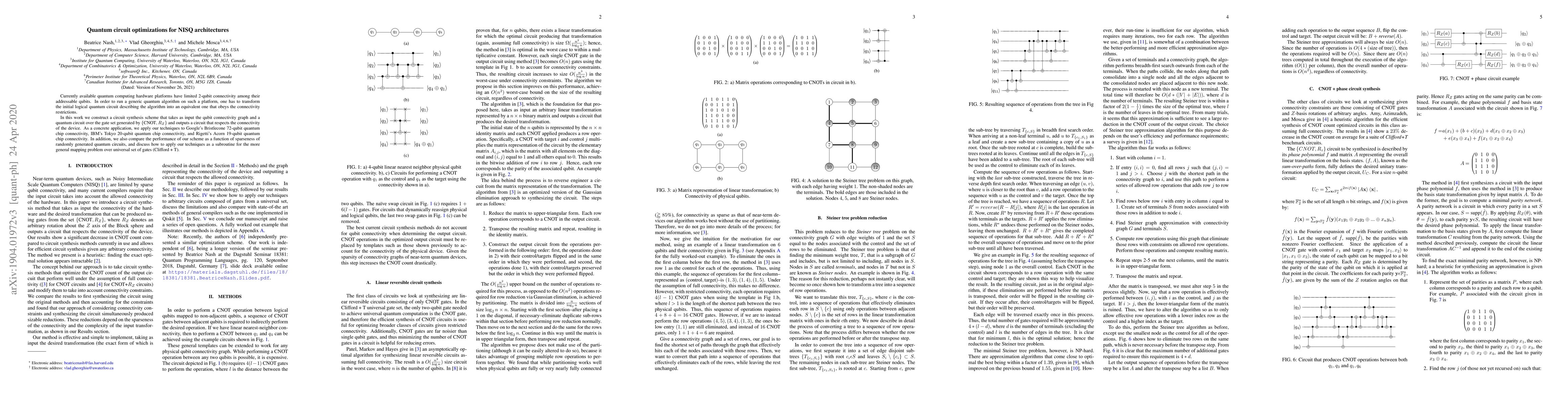 Currently available quantum computing hardware platforms have limited 2-qubit connectivity among their addressable qubits. In order to run a generic quantum algorithm on such a platform, one has to transform the initial logical quantum circuit describing the algorithm into an equivalent one that obeys the connectivity restrictions. In this work we construct a circuit synthesis scheme that takes as input the qubit connectivity graph and a quantum circuit over the gate set generated by $\{\text{CNOT},R_{Z}\}$ and outputs a circuit that respects the connectivity of the device. As a concrete application, we apply our techniques to Google's Bristlecone 72-qubit quantum chip connectivity, IBM's Tokyo 20-qubit quantum chip connectivity, and Rigetti's Acorn 19-qubit quantum chip connectivity. In addition, we also compare the performance of our scheme as a function of sparseness of randomly generated quantum circuits. Note: Recently, the authors of arXiv:1904.00633 independently presented a similar optimization scheme. Our work is independent of arXiv:1904.00633, being a longer version of the seminar presented by Beatrice Nash at the Dagstuhl Seminar 18381: Quantum Programming Languages, pg. 120, September 2018, Dagstuhl, Germany, slide deck available online at https://materials.dagstuhl.de/files/18/18381/18381.BeatriceNash.Slides.pdf.