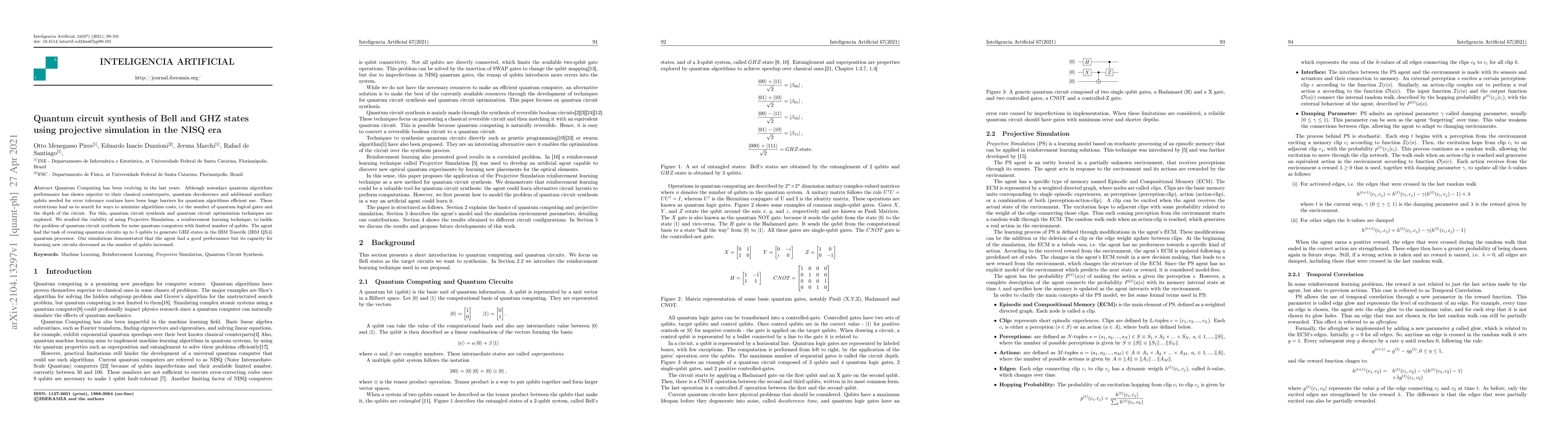 This paper explores quantum circuit synthesis for generating Bell and GHZ states using Projective Simulation on noise-limited quantum computers. Despite the agent's successful generation of circuits for up to 5 qubits, its learning efficiency diminished with increasing qubit count, highlighting challenges in scaling quantum algorithms.