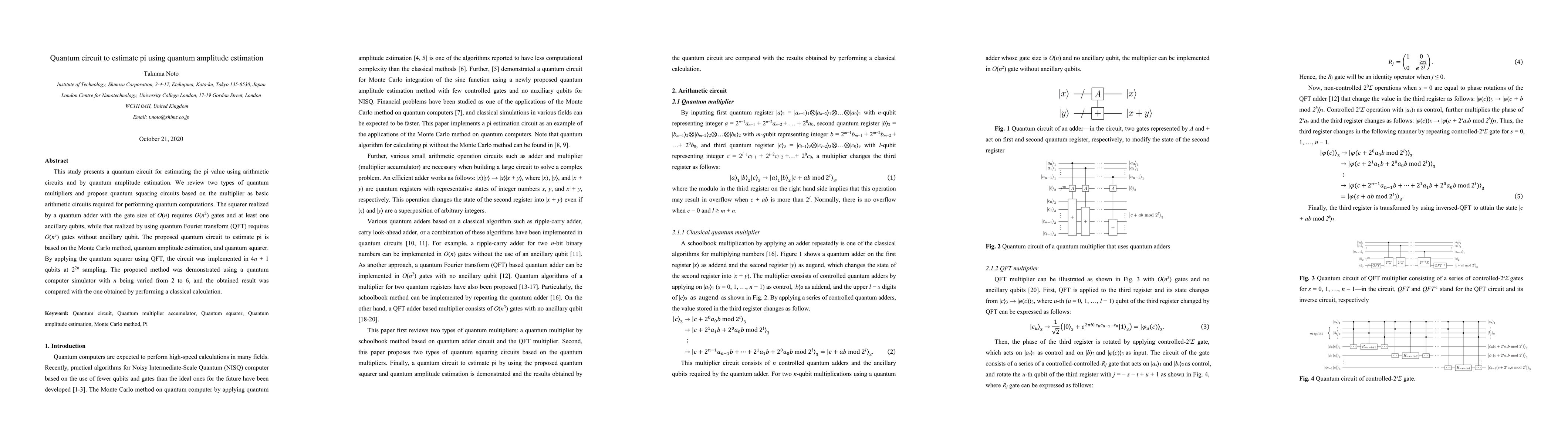 This study proposes a quantum circuit to estimate the value of pi using quantum amplitude estimation and arithmetic circuits, specifically quantum squaring circuits based on multipliers. The method was implemented in a quantum computer simulator and demonstrated to yield results comparable to classical calculations.