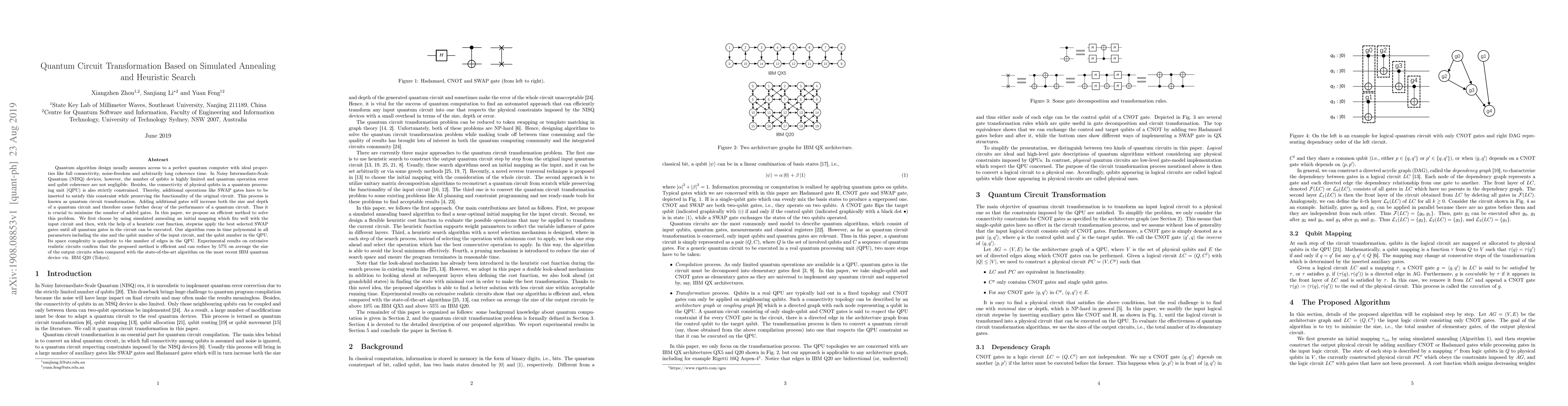 This paper proposes a quantum circuit transformation method using simulated annealing and heuristic search to optimize circuit mapping on Noisy Intermediate-Scale Quantum (NISQ) devices. The method aims to minimize the number of additional SWAP gates needed to satisfy qubit connectivity constraints, thereby reducing circuit size and depth. Experimental results show an average 57% reduction in circuit size compared to the state-of-the-art on IBM Q20.