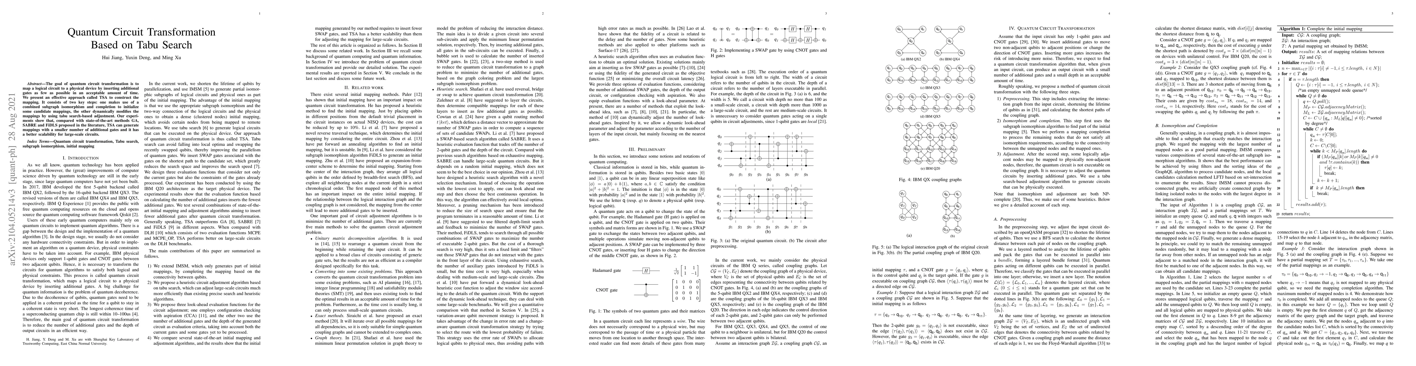 The goal of quantum circuit transformation is to map a logical circuit to a physical device by inserting additional gates as few as possible in an acceptable amount of time. We present an effective approach called TSA to construct the mapping. It consists of two key steps: one makes use of a combined subgraph isomorphism and completion to initialize some candidate mappings, the other dynamically modifies the mappings by using tabu search-based adjustment. Our experiments show that, compared with state-of-the-art methods GA, SABRE and FiDLS proposed in the literature, TSA can generate mappings with a smaller number of additional gates and it has a better scalability for large-scale circuits.