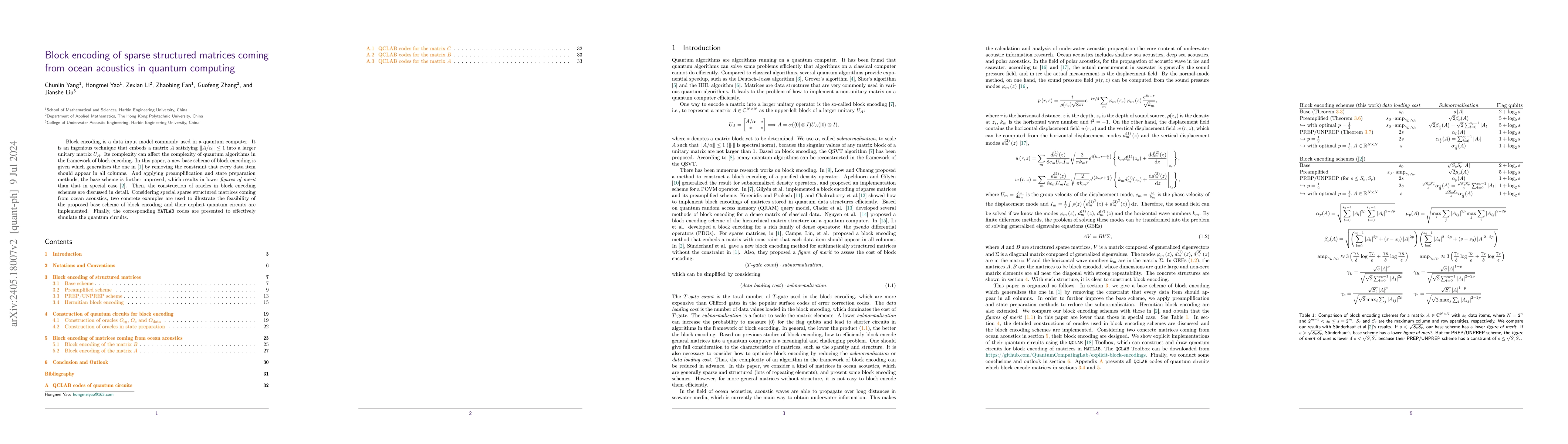 This paper presents a method for block encoding of structured matrices from ocean acoustics into quantum circuits, resulting in lower subnormalisations. The developed encoding schemes are demonstrated through numerical examples and MATLAB-based quantum circuit codes.