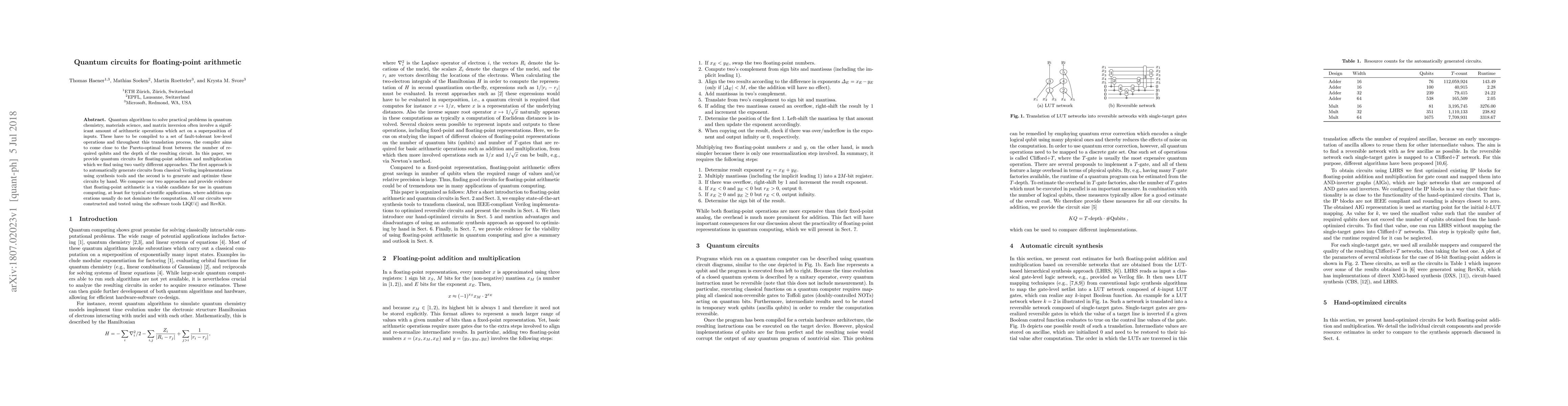 This paper presents quantum circuits for floating-point arithmetic, developed via automated synthesis from classical Verilog and manual optimization. The study demonstrates that floating-point arithmetic is feasible for quantum computing in scientific applications, balancing qubit usage and circuit depth.