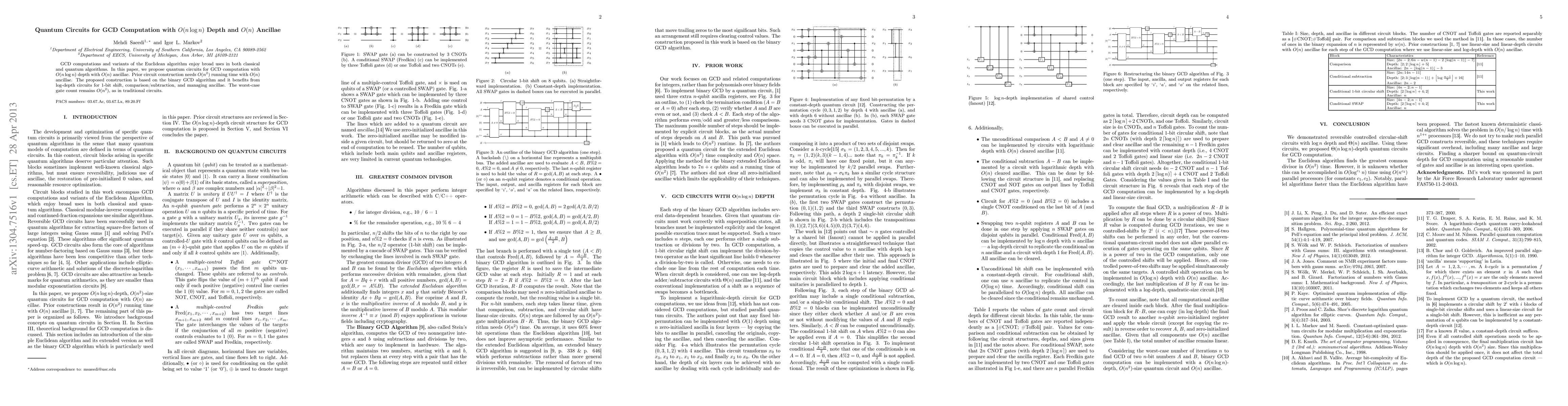 This paper proposes quantum circuits for GCD computation achieving $O(n \log n)$ depth and O(n) ancillae, significantly improving upon the previous $O(n^2)$ running time with the same ancilla complexity. The new design leverages the binary GCD algorithm and efficient log-depth circuits for basic operations.