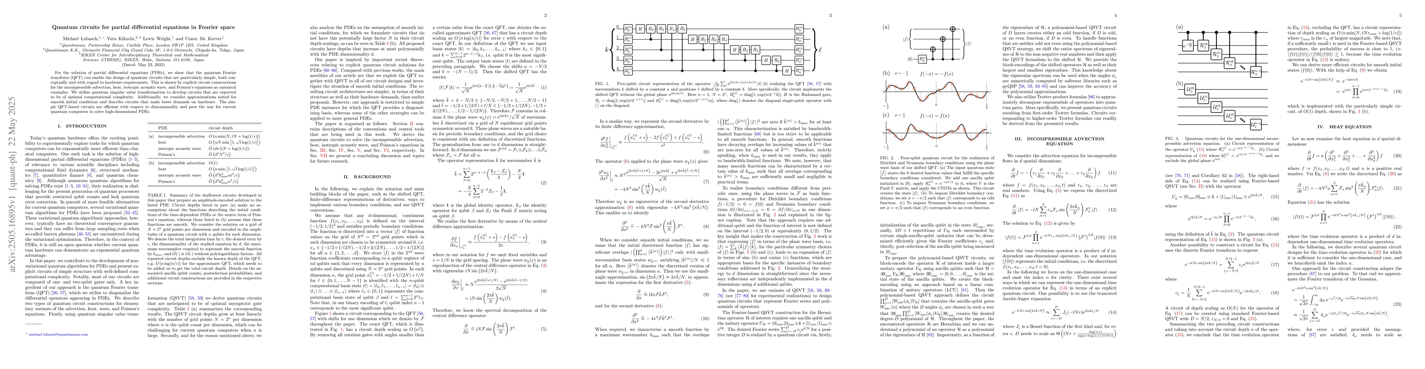 The research demonstrates the application of quantum circuits for solving partial differential equations (PDEs) in Fourier space, utilizing the quantum Fourier transform (QFT) and quantum singular value transformation for optimal computational complexity.