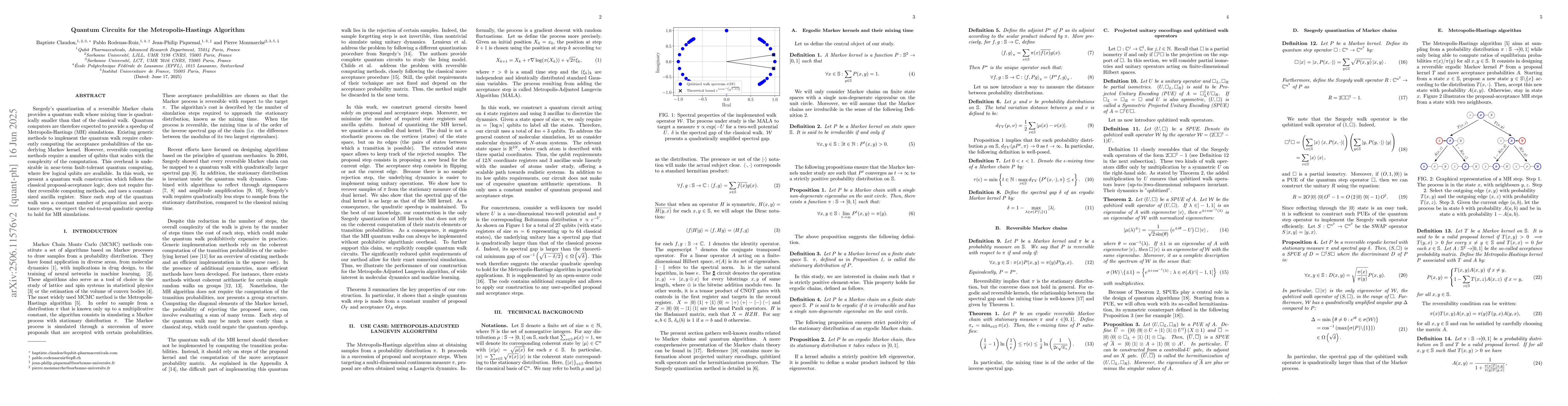 Szegedy's quantization of a reversible Markov chain provides a quantum walk whose mixing time is quadratically smaller than that of the classical walk. Quantum computers are therefore expected to provide a speedup of Metropolis-Hastings (MH) simulations. Existing generic methods to implement the quantum walk require coherently computing the acceptance probabilities of the underlying Markov kernel. However, reversible computing methods require a number of qubits that scales with the complexity of the computation. This overhead is undesirable in near-term fault-tolerant quantum computing, where few logical qubits are available. In this work, we present a quantum walk construction which follows the classical proposal-acceptance logic, does not require further reversible computing methods, and uses a constant-sized ancilla register. Since each step of the quantum walk uses a constant number of proposition and acceptance steps, we expect the end-to-end quadratic speedup to hold for MH simulations.