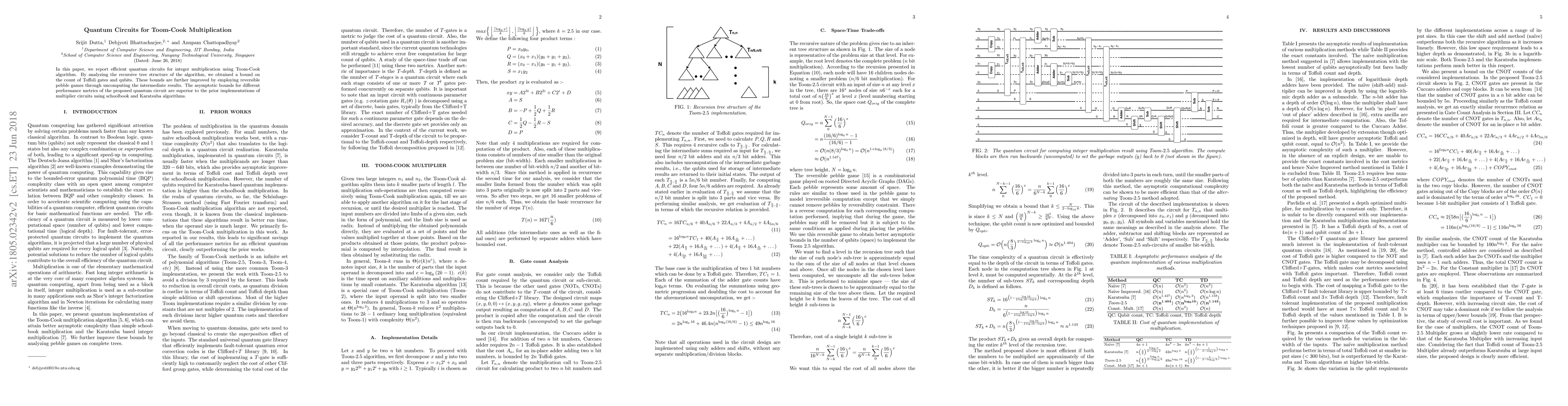 This paper presents efficient quantum circuits for integer multiplication based on the Toom-Cook algorithm, optimizing the use of Toffoli gates and qubits through reversible pebble games and uncomputing techniques. The proposed quantum circuit outperforms previous multiplier circuits using schoolbook and Karatsuba methods in terms of asymptotic performance metrics.
