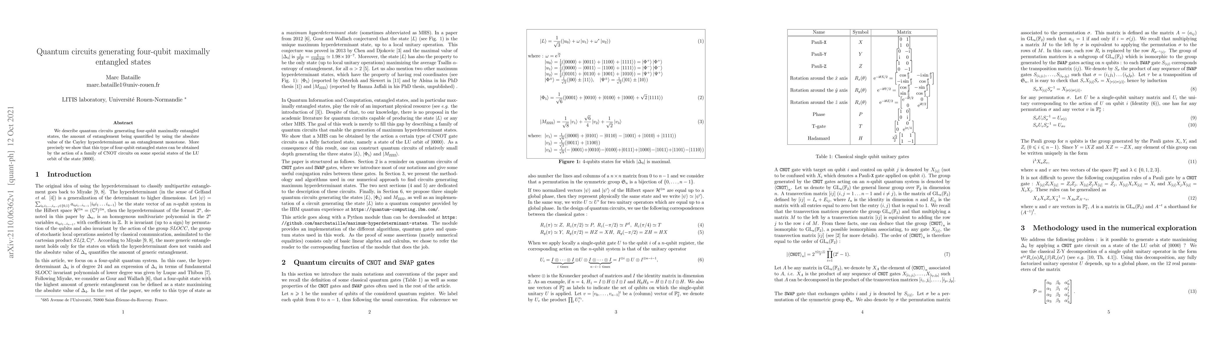 Summary: This paper presents quantum circuits that generate four-qubit maximally entangled states, quantified using the Cayley hyperdeterminant. The entanglement is achieved via CNOT operations on specific LU orbit states derived from |0000>.