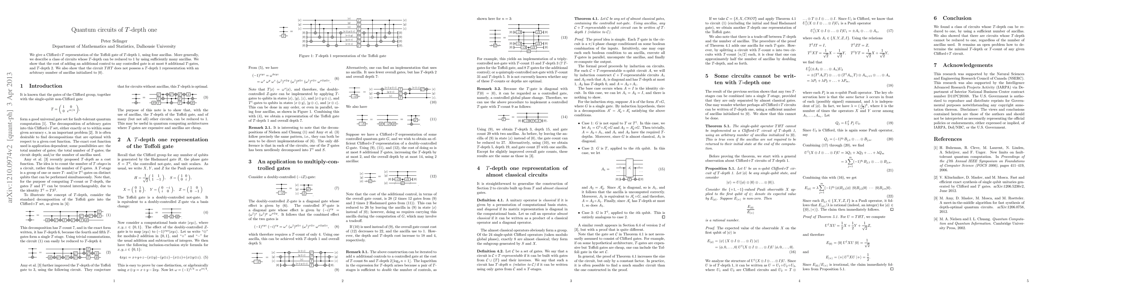This paper presents a Clifford+T representation for the Toffoli gate with T-depth 1 using four ancillas and discusses circuits reducible to T-depth 1 via sufficient ancilla usage. It concludes that adding a control increases T-depth to 2 with a cost of up to 8 additional T-gates, and establishes that the THT circuit cannot be represented with T-depth 1 regardless of ancilla count.