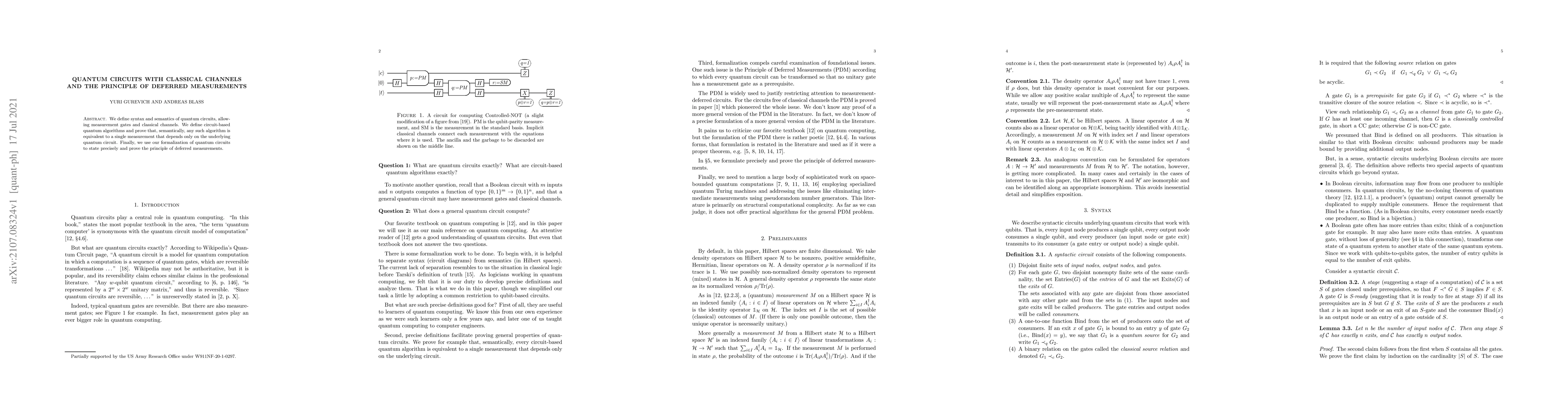 We define syntax and semantics of quantum circuits, allowing measurement gates and classical channels. We define circuit-based quantum algorithms and prove that, semantically, any such algorithm is equivalent to a single measurement that depends only on the underlying quantum circuit. Finally, we use our formalization of quantum circuits to state precisely and prove the principle of deferred measurements.