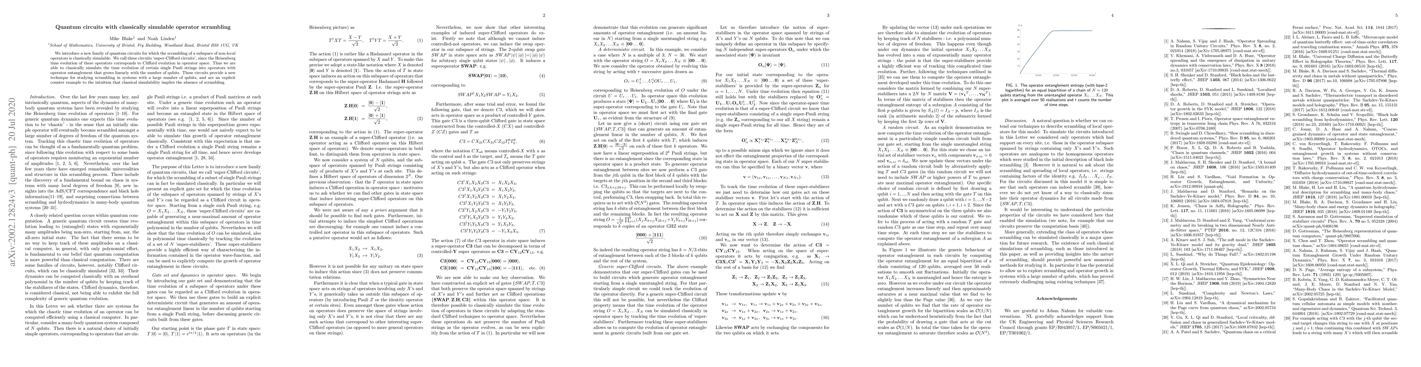 This paper introduces "super-Clifford circuits," a novel quantum circuit family where the scrambling of non-local operators can be classically simulated. These circuits demonstrate that classical simulability does not preclude operator entanglement, providing a new method for studying scrambling in large qubit systems.