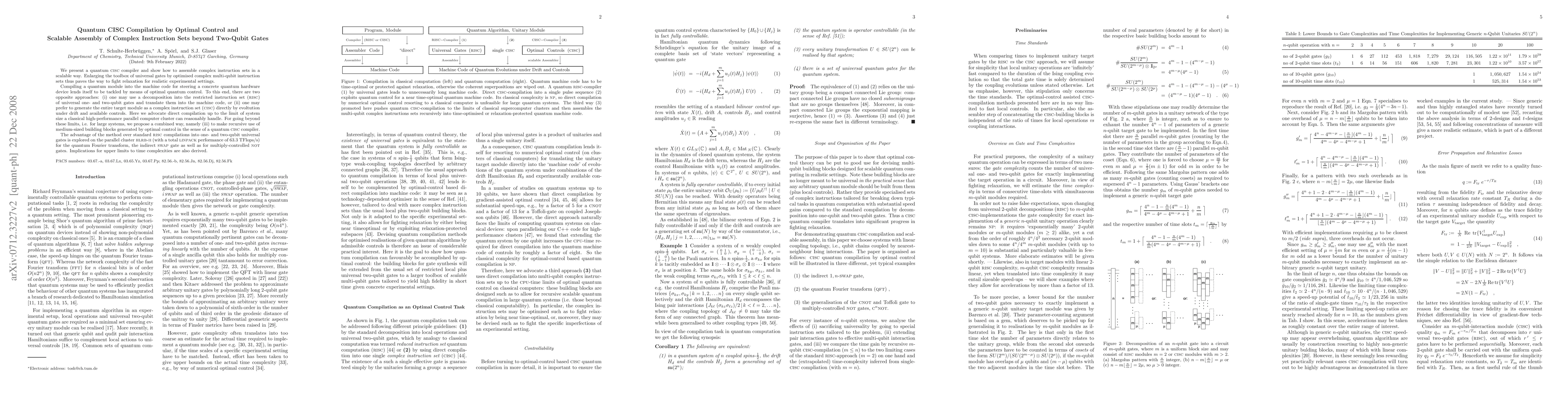 We present a quantum CISC compiler and show how to assemble complex instruction sets in a scalable way. Enlarging the toolbox of universal gates by optimised complex multi-qubit instruction sets thus paves the way to fight decoherence for realistic settings. Compiling a quantum module into the machine code for steering a concrete quantum hardware device lends itself to be tackled by means of optimal quantum control. To this end, there are two opposite approaches: (i) one may use a decomposition into the restricted instruction set (RISC) of universal one- and two-qubit gates, which in turn have prefabricated translations into the machine code or (ii) one may prefer to generate the entire target module directly by a complex instruction set (CISC) of available controls. Here we advocate direct compilation up to the limit of system size a classical high-performance parallel computer cluster can reasonably handle. For going beyond these limits, i.e. for large systems we propose a combined way, namely (iii) to make recursive use of medium-sized building blocks generated by optimal control in the sense of a quantum CISC compiler. The advantage of the method over standard RISC compilations into one- and two-qubit universal gates is explored on the parallel cluster HLRB-II (with a total LINPACK performance of 63.3 TFlops/s) for the quantum Fourier transform, the indirect SWAP gate as well as for multiply-controlled CNOT gates. Implications for upper limits to time complexities are also derived.