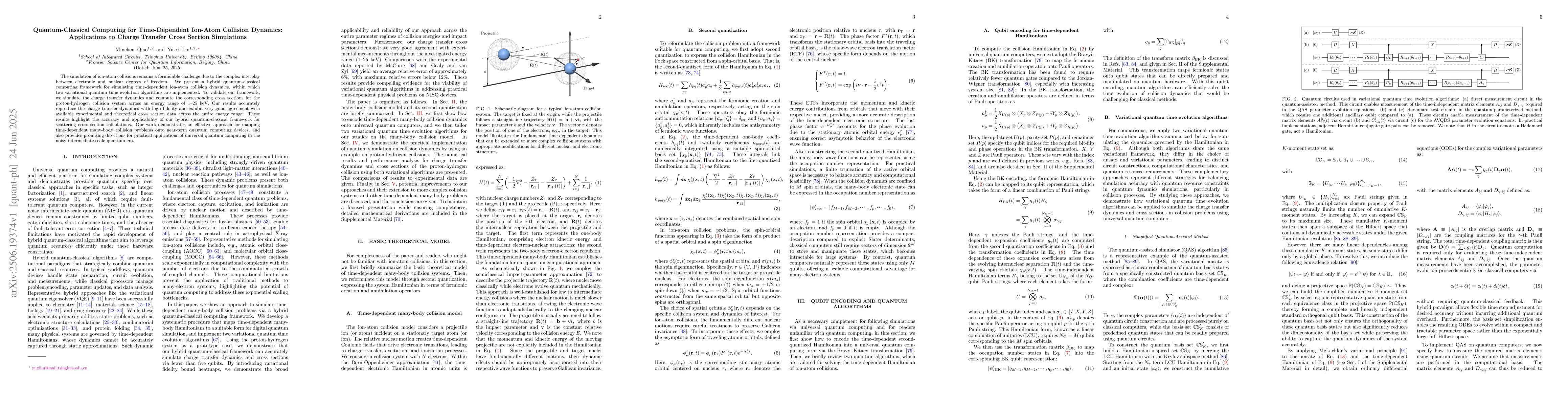 The simulation of ion-atom collisions remains a formidable challenge due to the complex interplay between electronic and nuclear degrees of freedom. We present a hybrid quantum-classical computing framework for simulating time-dependent ion-atom collision dynamics, within which two variational quantum time evolution algorithms are implemented. To validate our framework, we simulate the charge transfer dynamics and compute the corresponding cross sections for the proton-hydrogen collision system across an energy range of 1--25~keV. Our results accurately reproduce the charge transfer dynamics with high fidelity and exhibit very good agreement with available experimental and theoretical cross section data across the entire energy range. These results highlight the accuracy and applicability of our hybrid quantum-classical framework for scattering cross section calculations. Our work demonstrates an effective approach for mapping time-dependent many-body collision problems onto near-term quantum computing devices, and also provides promising directions for practical applications of universal quantum computing in the noisy intermediate-scale quantum era.