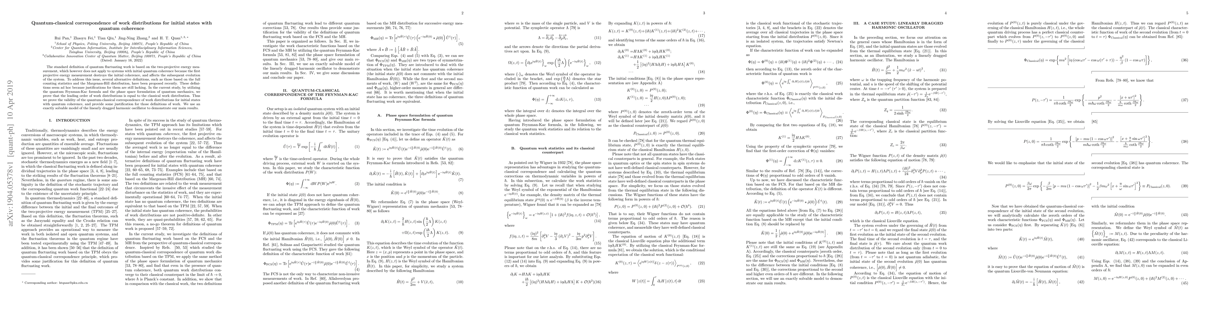 The standard definition of quantum fluctuating work is based on the two-projective energy measurement, which however does not apply to systems with initial quantum coherence because the first projective energy measurement destroys the initial coherence, and affects the subsequent evolution of the system. To address this issue, several alternative definitions, such as those based on the full counting statistics and the Margenau-Hill distribution, have been proposed recently. These definitions seem ad hoc because justifications for them are still lacking. In the current study, by utilizing the quantum Feynman-Kac formula and the phase space formulation of quantum mechanics, we prove that the leading order of work distributions is equal to the classical work distribution. Thus we prove the validity of the quantum-classical correspondence of work distributions for initial states with quantum coherence, and provide some justification for those definitions of work. We use an exactly solvable model of the linearly dragged harmonic oscillator to demonstrate our main results.