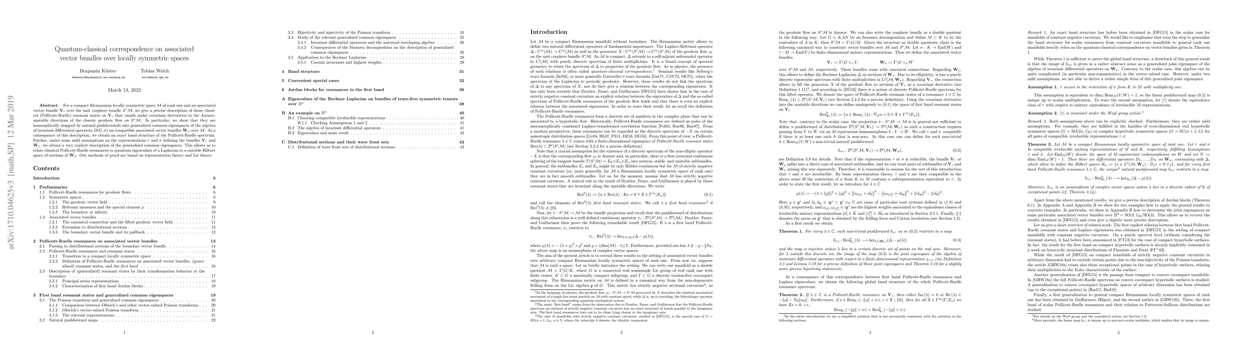 For a compact Riemannian locally symmetric space $\mathcal M$ of rank one and an associated vector bundle $\mathbf V_\tau$ over the unit cosphere bundle $S^\ast\mathcal M$, we give a precise description of those classical (Pollicott-Ruelle) resonant states on $\mathbf V_\tau$ that vanish under covariant derivatives in the Anosov-unstable directions of the chaotic geodesic flow on $S^\ast\mathcal M$. In particular, we show that they are isomorphically mapped by natural pushforwards into generalized common eigenspaces of the algebra of invariant differential operators $D(G,\sigma)$ on compatible associated vector bundles $\mathbf W_\sigma$ over $\mathcal M$. As a consequence of this description, we obtain an exact band structure of the Pollicott-Ruelle spectrum. Further, under some mild assumptions on the representations $\tau$ and $\sigma$ defining the bundles $\mathbf V_\tau$ and $\mathbf W_\sigma$, we obtain a very explicit description of the generalized common eigenspaces. This allows us to relate classical Pollicott-Ruelle resonances to quantum eigenvalues of a Laplacian in a suitable Hilbert space of sections of $\mathbf W_\sigma$. Our methods of proof are based on representation theory and Lie theory.