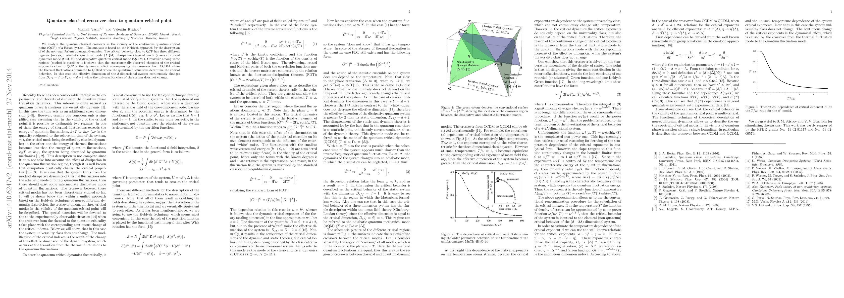 We analyze the quantum-classical crossover in the vicinity of the continuous quantum critical point (QCP) of a Boson system. The analysis is based on the Keldysh approach for the description of of the non-equilibrium quantum dynamics. The critical behavior close to QCP has three different regimes (modes): adiabatic quantum mode (AQM), dissipative classical mode (classical critical dynamics mode (CCDM) and dissipative quantum critical mode (QCDM). Crossover among these regimes (modes) is possible: it is shown that the experimentally observed changing of the critical exponents close to QCP is the dynamical effect accompanying the crossover from CCDM where the thermal fluctuations dominate to QCDM where the quantum fluctuations determine the critical behavior. In this case the effective dimension of the $d$-dimensional system continuously changes from $D_{eff}=d$ to $D_{eff}=d+2$ while the universality class of the system does not change.