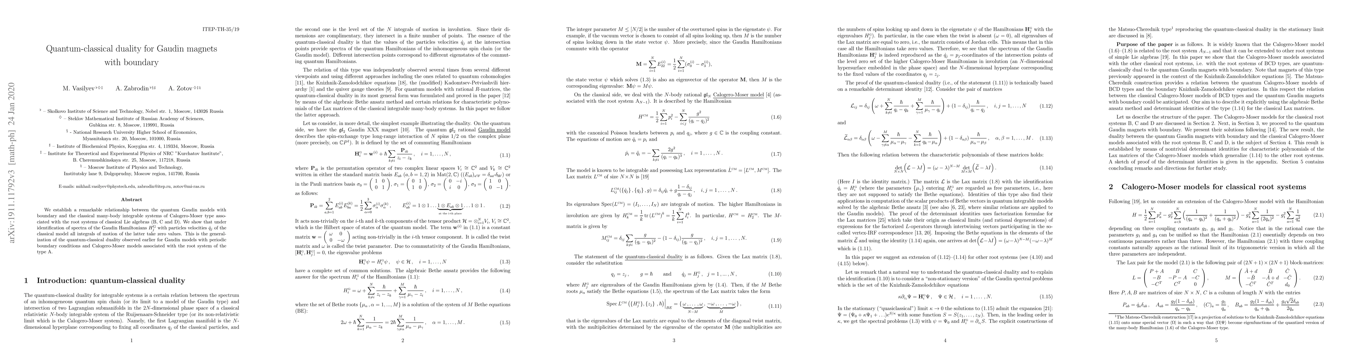 This paper establishes a quantum-classical duality between quantum Gaudin models with boundary conditions and classical many-body integrable systems, specifically Calogero-Moser models linked to root systems of classical Lie algebras B, C, and D. It demonstrates that identifying spectra of Gaudin Hamiltonians with particle velocities in the classical model results in all classical integrals of motion equating to zero.