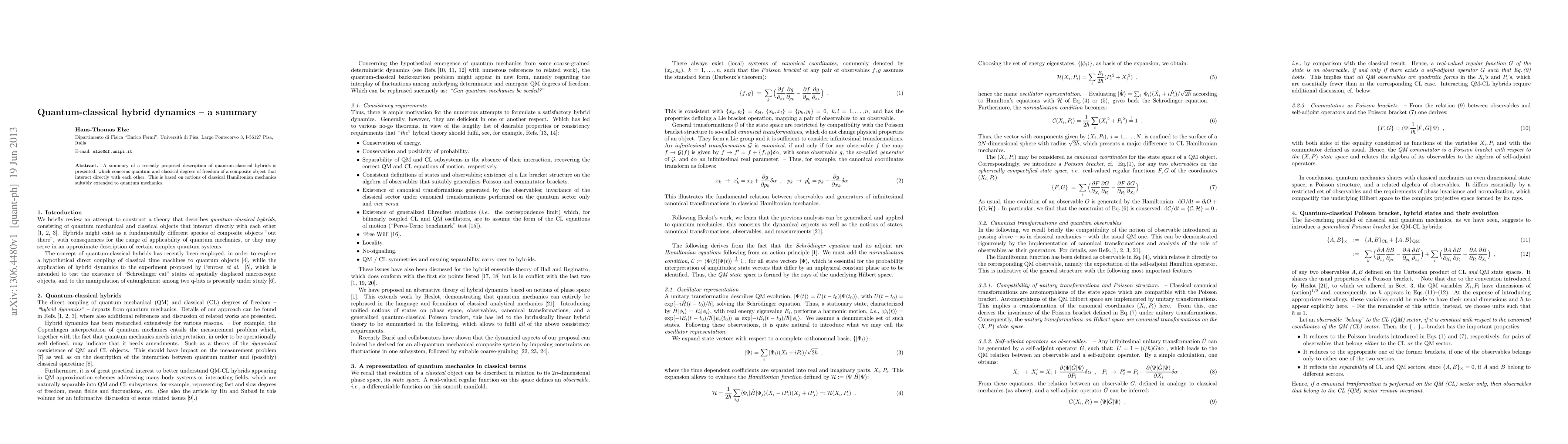 The research proposes a quantum-classical hybrid dynamics theory based on classical Hamiltonian mechanics extended to quantum mechanics, introducing unified notions of states, observables, canonical transformations, and a generalized quantum-classical Poisson bracket, fulfilling numerous consistency requirements.