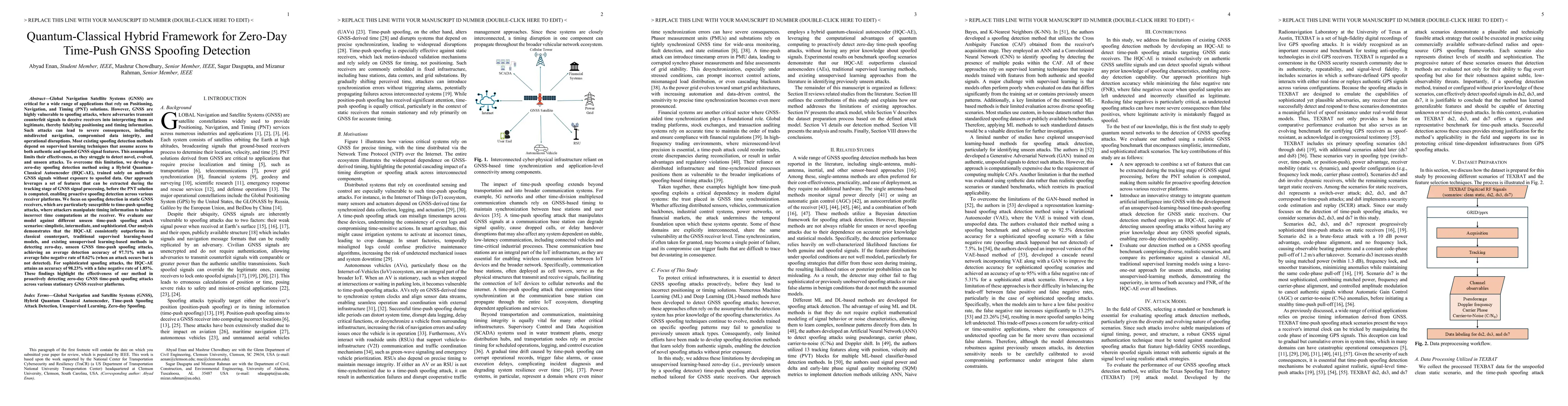 Global Navigation Satellite Systems (GNSS) are critical for Positioning, Navigation, and Timing (PNT) applications. However, GNSS are highly vulnerable to spoofing attacks, where adversaries transmit counterfeit signals to mislead receivers. Such attacks can lead to severe consequences, including misdirected navigation, compromised data integrity, and operational disruptions. Most existing spoofing detection methods depend on supervised learning techniques and struggle to detect novel, evolved, and unseen attacks. To overcome this limitation, we develop a zero-day spoofing detection method using a Hybrid Quantum-Classical Autoencoder (HQC-AE), trained solely on authentic GNSS signals without exposure to spoofed data. By leveraging features extracted during the tracking stage, our method enables proactive detection before PNT solutions are computed. We focus on spoofing detection in static GNSS receivers, which are particularly susceptible to time-push spoofing attacks, where attackers manipulate timing information to induce incorrect time computations at the receiver. We evaluate our model against different unseen time-push spoofing attack scenarios: simplistic, intermediate, and sophisticated. Our analysis demonstrates that the HQC-AE consistently outperforms its classical counterpart, traditional supervised learning-based models, and existing unsupervised learning-based methods in detecting zero-day, unseen GNSS time-push spoofing attacks, achieving an average detection accuracy of 97.71% with an average false negative rate of 0.62% (when an attack occurs but is not detected). For sophisticated spoofing attacks, the HQC-AE attains an accuracy of 98.23% with a false negative rate of 1.85%. These findings highlight the effectiveness of our method in proactively detecting zero-day GNSS time-push spoofing attacks across various stationary GNSS receiver platforms.