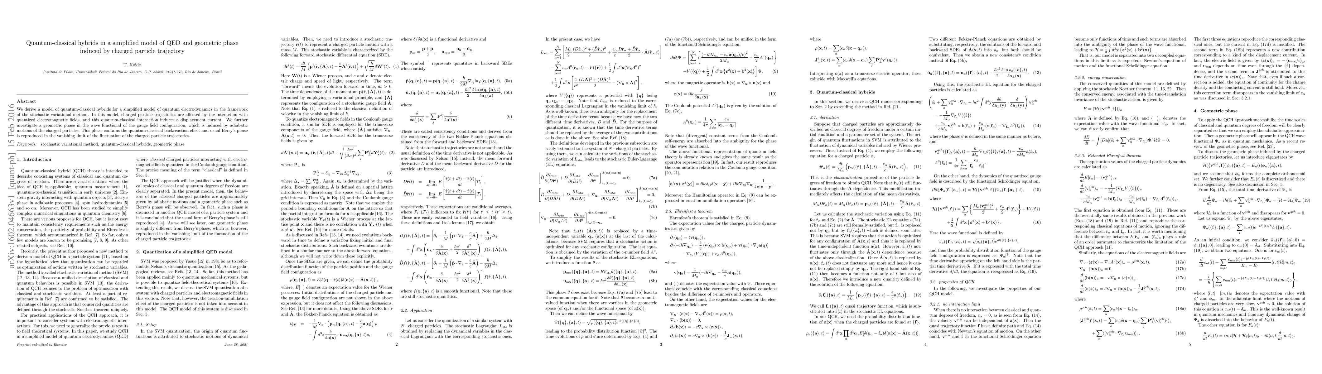 This paper develops a quantum-classical hybrid model for a simplified quantum electrodynamics framework using the stochastic variational method, where charged particle trajectories influence quantized electromagnetic fields, inducing a displacement current. It also explores a geometric phase in the wave functional of the gauge field, which incorporates quantum-classical backreaction effects and reduces to Berry's phase under minimal trajectory fluctuations.
