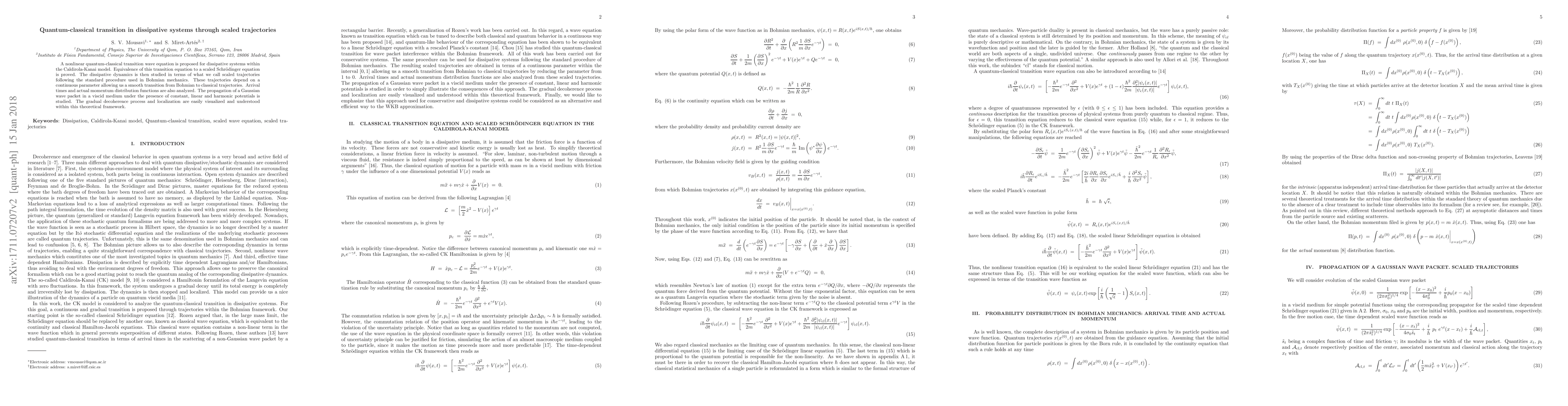 A nonlinear quantum-classical transition wave equation is proposed for dissipative systems within the Caldirola-Kanai model. Equivalence of this transition equation to a scaled Schr\"{o}dinger equation is proved. The dissipative dynamics is then studied in terms of what we call scaled trajectories following the standard procedure used in Bohmian mechanics. These trajectories depend on a continuous parameter allowing us a smooth transition from Bohmian to classical trajectories. Arrival times and actual momentum distribution functions are also analyzed. The propagation of a Gaussian wave packet in a viscid medium under the presence of constant, linear and harmonic potentials is studied. The gradual decoherence process and localization are easily visualized and understood within this theoretical framework.