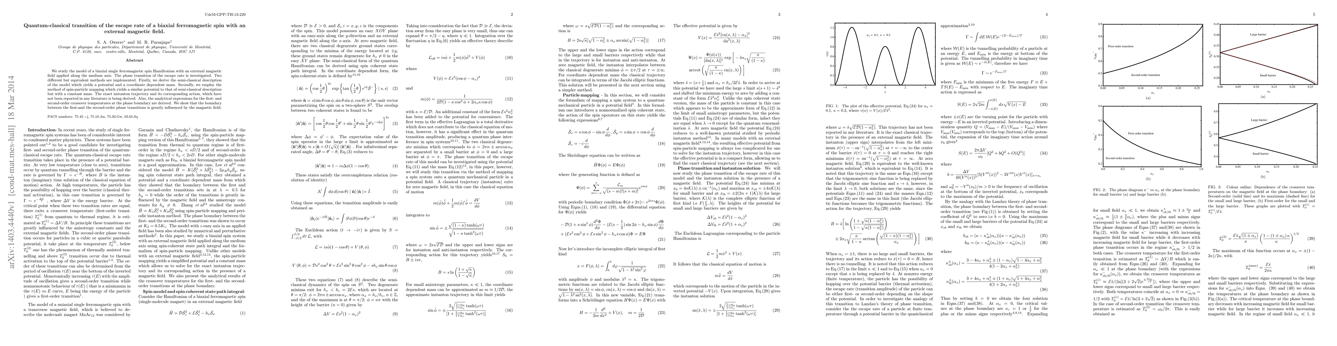 We study the model of a biaxial single ferromagnetic spin Hamiltonian with an external magnetic field applied along the medium axis. The phase transition of the escape rate is investigated. Two different but equivalent methods are implemented. Firstly, we derive the semi-classical description of the model which yields a potential and a coordinate dependent mass. Secondly, we employ the method of spin-particle mapping which yields a similar potential to that of semi-classical description but with a constant mass. The exact instanton trajectory and its corresponding action, which have not been reported in any literature is being derived. Also, the analytical expressions for the first- and second-order crossover temperatures at the phase boundary are derived. We show that the boundary between the first-and the second-order phase transitions is greatly influenced by the magnetic field.