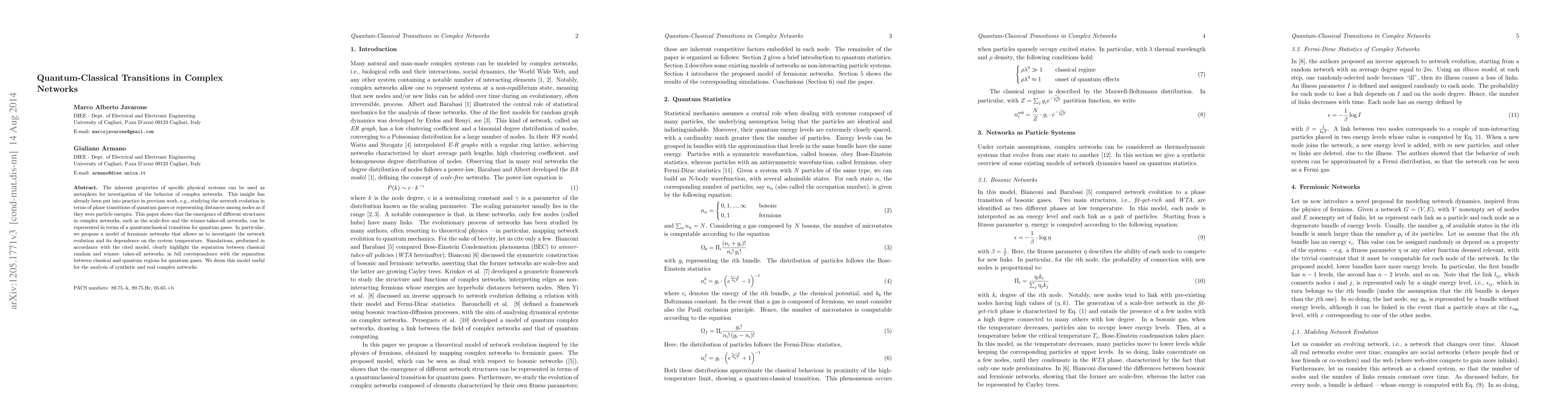 The inherent properties of specific physical systems can be used as metaphors for investigation of the behavior of complex networks. This insight has already been put into practice in previous work, e.g., studying the network evolution in terms of phase transitions of quantum gases or representing distances among nodes as if they were particle energies. This paper shows that the emergence of different structures in complex networks, such as the scale-free and the winner-takes-all networks, can be represented in terms of a quantum-classical transition for quantum gases. In particular, we propose a model of fermionic networks that allows us to investigate the network evolution and its dependence on the system temperature. Simulations, performed in accordance with the cited model, clearly highlight the separation between classical random and winner-takes-all networks, in full correspondence with the separation between classical and quantum regions for quantum gases. We deem this model useful for the analysis of synthetic and real complex networks.