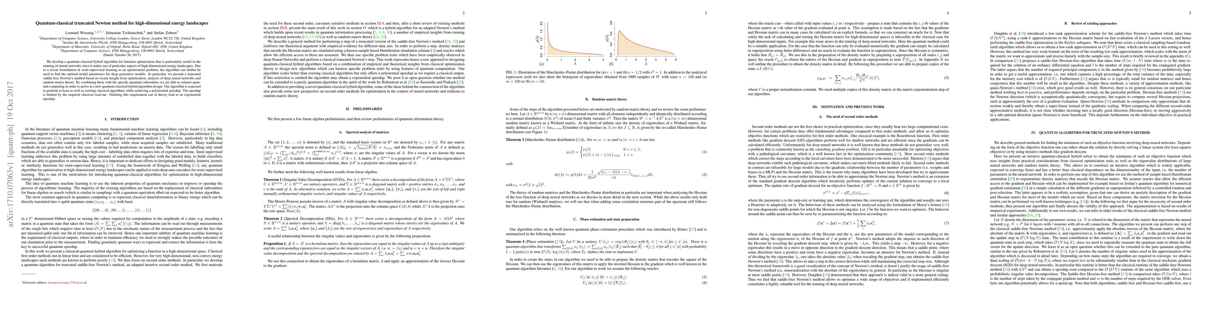We develop a quantum-classical hybrid algorithm for function optimization that is particularly useful in the training of neural networks since it makes use of particular aspects of high-dimensional energy landscapes. Due to a recent formulation of semi-supervised learning as an optimization problem, the algorithm can further be used to find the optimal model parameters for deep generative models. In particular, we present a truncated saddle-free Newton's method based on recent insight from optimization, analysis of deep neural networks and random matrix theory. By combining these with the specific quantum subroutines we are able to exhaust quantum computing in order to arrive at a new quantum-classical hybrid algorithm design. Our algorithm is expected to perform at least as well as existing classical algorithms while achieving a polynomial speedup. The speedup is limited by the required classical read-out. Omitting this requirement can in theory lead to an exponential speedup.