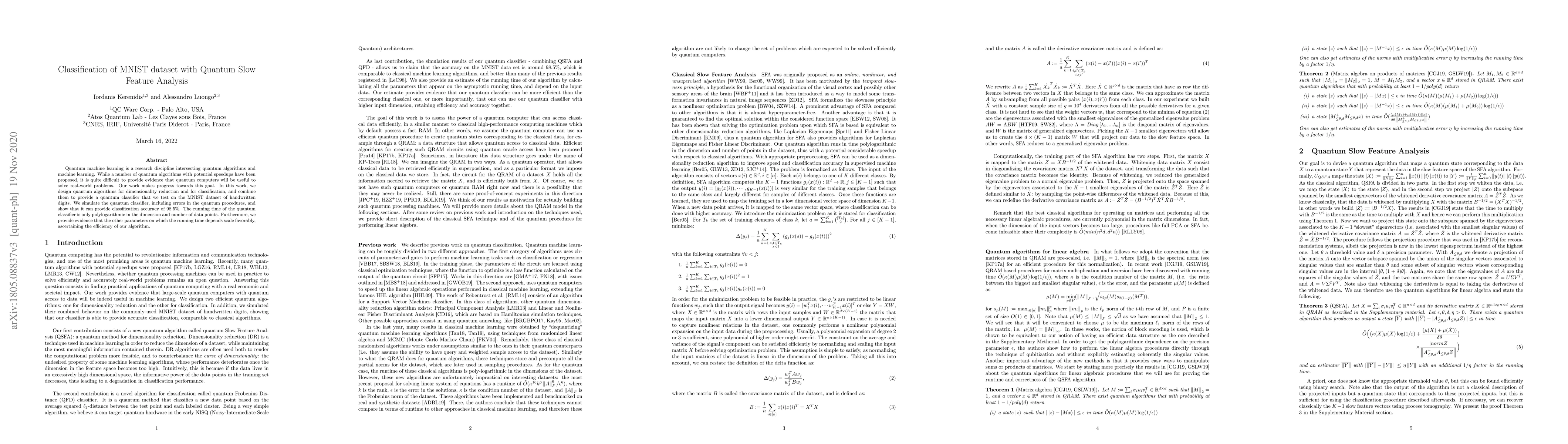 Quantum machine learning carries the promise to revolutionize information and communication technologies. While a number of quantum algorithms with potential exponential speedups have been proposed already, it is quite difficult to provide convincing evidence that quantum computers with quantum memories will be in fact useful to solve real-world problems. Our work makes considerable progress towards this goal. We design quantum techniques for Dimensionality Reduction and for Classification, and combine them to provide an efficient and high accuracy quantum classifier that we test on the MNIST dataset. More precisely, we propose a quantum version of Slow Feature Analysis (QSFA), a dimensionality reduction technique that maps the dataset in a lower dimensional space where we can apply a novel quantum classification procedure, the Quantum Frobenius Distance (QFD). We simulate the quantum classifier (including errors) and show that it can provide classification of the MNIST handwritten digit dataset, a widely used dataset for benchmarking classification algorithms, with $98.5\%$ accuracy, similar to the classical case. The running time of the quantum classifier is polylogarithmic in the dimension and number of data points. We also provide evidence that the other parameters on which the running time depends (condition number, Frobenius norm, error threshold, etc.) scale favorably in practice, thus ascertaining the efficiency of our algorithm.