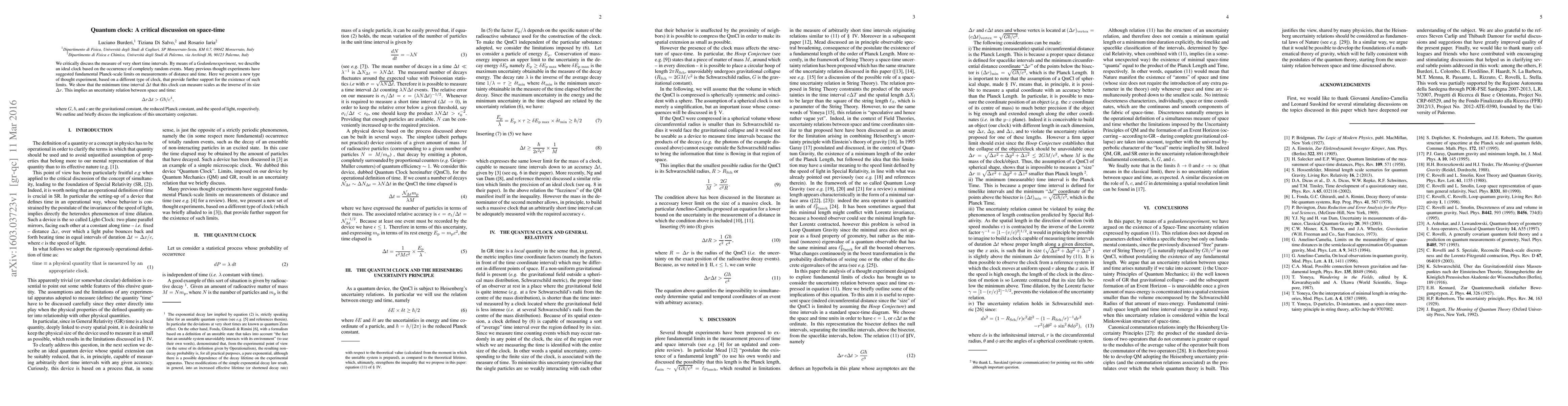We critically discuss the measure of very short time intervals. By means of a Gedankenexperiment, we describe an ideal clock based on the occurrence of completely random events. Many previous thought experiments have suggested fundamental Planck-scale limits on measurements of distance and time. Here we present a new type of thought experiment, based on a different type of clock, that provide further support for the existence of such limits. We show that the minimum time interval $\Delta t$ that this clock can measure scales as the inverse of its size $\Delta r$. This implies an uncertainty relation between space and time: $\Delta r$ $\Delta t$ $> G \hbar / c^4$; where G, $\hbar$ and c are the gravitational constant, the reduced Planck constant, and the speed of light, respectively. We outline and briefly discuss the implications of this uncertainty conjecture.