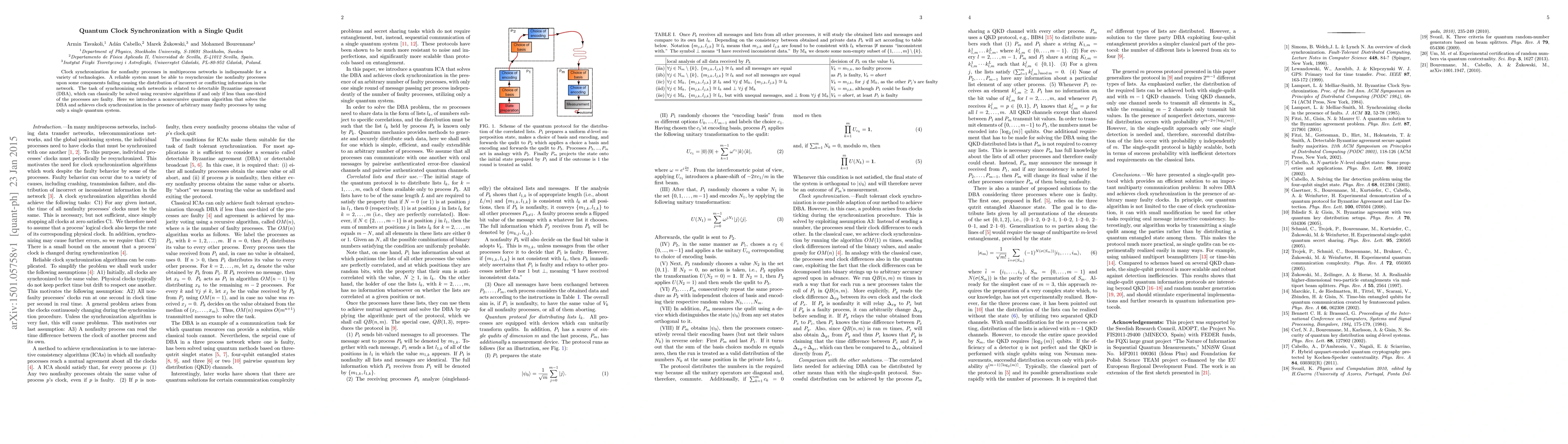 This paper presents a quantum algorithm for clock synchronization in multiprocess networks using a single qudit, addressing detectable Byzantine agreement (DBA) and enabling synchronization even when more than one-third of the processes are faulty. This approach provides a novel nonrecursive solution to classical synchronization problems.