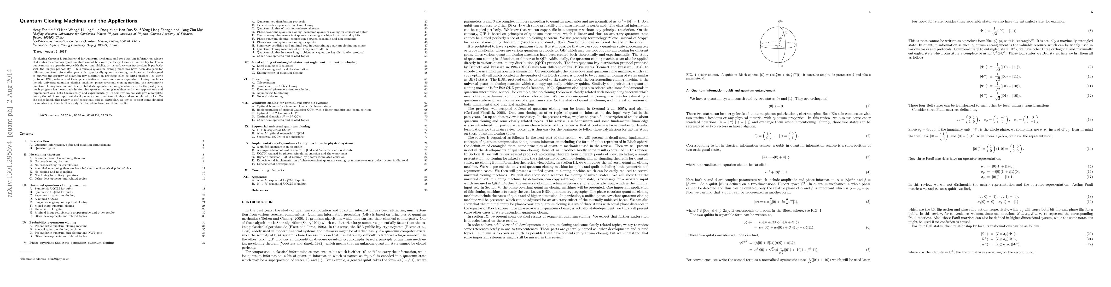 No-cloning theorem is fundamental for quantum mechanics and for quantum information science that states an unknown quantum state cannot be cloned perfectly. However, we can try to clone a quantum state approximately with the optimal fidelity, or instead, we can try to clone it perfectly with the largest probability. Thus various quantum cloning machines have been designed for different quantum information protocols. Specifically, quantum cloning machines can be designed to analyze the security of quantum key distribution protocols such as BB84 protocol, six-state protocol, B92 protocol and their generalizations. Some well-known quantum cloning machines include universal quantum cloning machine, phase-covariant cloning machine, the asymmetric quantum cloning machine and the probabilistic quantum cloning machine etc. In the past years, much progress has been made in studying quantum cloning machines and their applications and implementations, both theoretically and experimentally. In this review, we will give a complete description of those important developments about quantum cloning and some related topics. On the other hand, this review is self-consistent, and in particular, we try to present some detailed formulations so that further study can be taken based on those results.