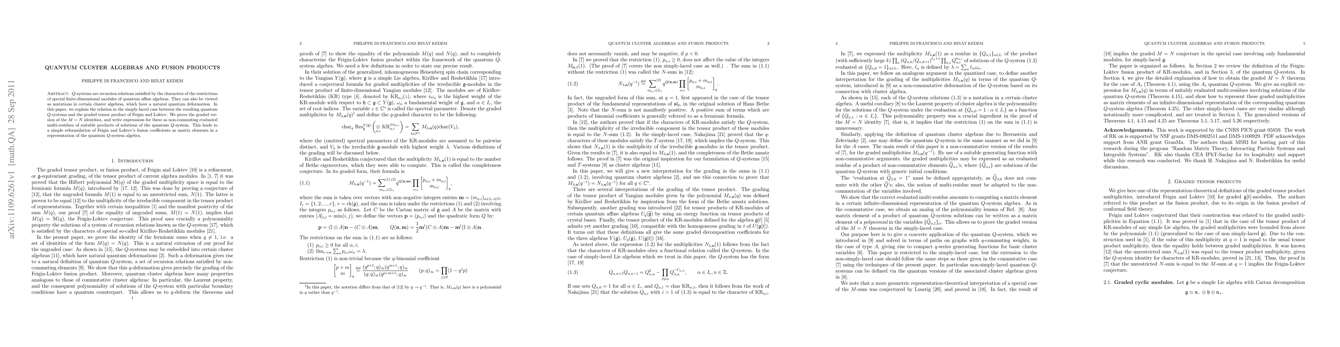$Q$-systems are recursion relations satisfied by the characters of the restrictions of special finite-dimensional modules of quantum affine algebras. They can also be viewed as mutations in certain cluster algebras, which have a natural quantum deformation. In this paper, we explain the relation in the simply-laced case between the resulting quantum $Q$-systems and the graded tensor product of Feigin and Loktev. We prove the graded version of the $M=N$ identities, and write expressions for these as non-commuting evaluated multi-residues of suitable products of solutions of the quantum $Q$-system. This leads to a simple reformulation of Feigin and Loktev's fusion coefficients as matrix elements in a representation of the quantum $Q$-system algebra.