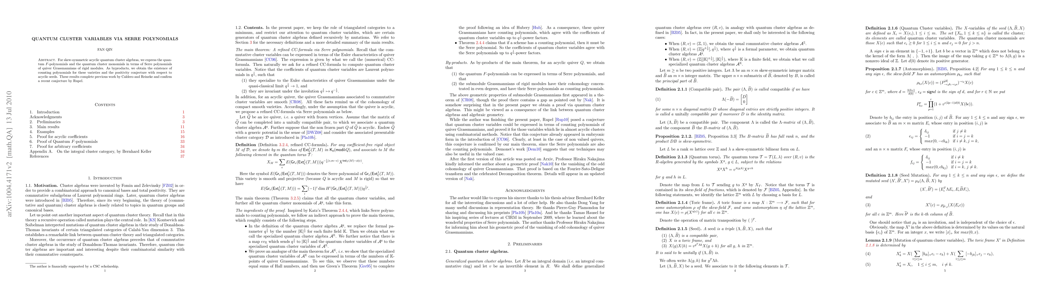 This paper expresses quantum $F$-polynomials and cluster monomials in skew-symmetric acyclic quantum cluster algebras using Serre polynomials of quiver Grassmannians. It confirms the existence of counting polynomials for these varieties and supports the positivity conjecture for acyclic seeds.