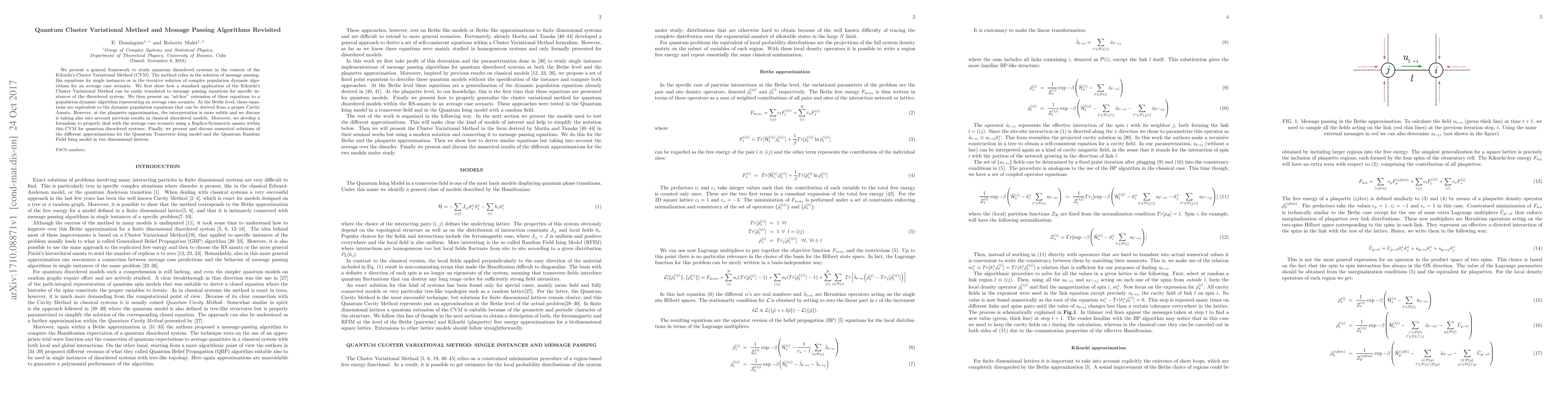 We present a general framework to study quantum disordered systems in the context of the Kikuchi's Cluster Variational Method (CVM). The method relies in the solution of message passing-like equations for single instances or in the iterative solution of complex population dynamic algorithms for an average case scenario. We first show how a standard application of the Kikuchi's Cluster Variational Method can be easily translated to message passing equations for specific instances of the disordered system. We then present an "ad-hoc" extension of these equations to a population dynamic algorithm representing an average case scenario. At the Bethe level, these equations are equivalent to the dynamic population equations that can be derived from a proper Cavity Ansatz. However, at the plaquette approximation, the interpretation is more subtle and we discuss it taking also into account previous results in classical disordered models. Moreover, we develop a formalism to properly deal with the average case scenario using a Replica-Symmetric ansatz within this CVM for quantum disordered systems. Finally, we present and discuss numerical solutions of the different approximations for the Quantum Transverse Ising model and the Quantum Random Field Ising model in two dimensional lattices.