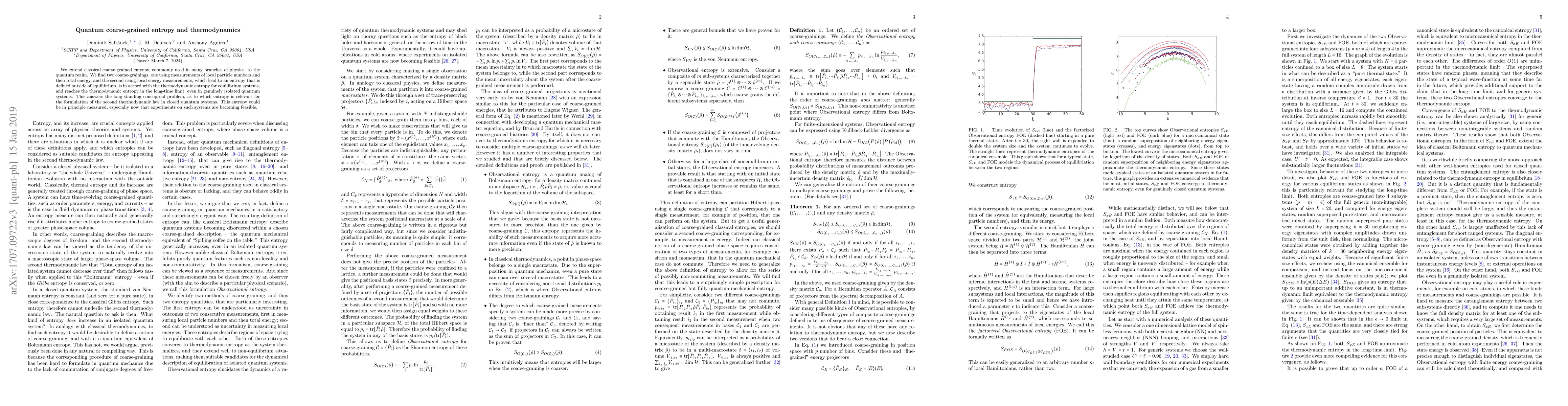 This paper introduces a quantum version of coarse-grained entropy, applicable to isolated quantum systems, which aligns with classical thermodynamic entropy for equilibrium states and resolves the long-standing question of entropy relevance in quantum thermodynamics. The proposed entropy can be potentially measured with advancing experimental techniques.