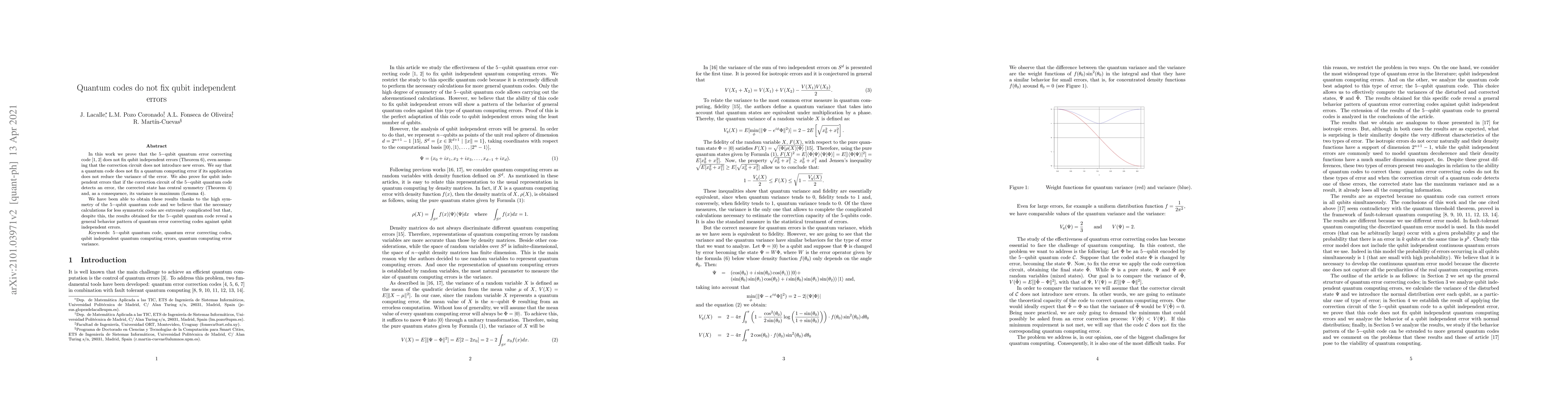 In this work we prove that the 5-qubit quantum error correcting code does not fix qubit independent errors, even assuming that the correction circuit does not introduce new errors. We say that a quantum code does not fix a quantum computing error if its application does not reduce the variance of the error. We also prove for qubit independent errors that if the correction circuit of the 5-qubit quantum code detects an error, the corrected state has central symmetry and, as a consequence, its variance is maximum. We have been able to obtain these results thanks to the high symmetry of the 5-qubit quantum code and we believe that the necessary calculations for less symmetric codes are extremely complicated but that, despite this, the results obtained for the 5-qubit quantum code reveal a general behavior pattern of quantum error correcting codes against qubit independent errors.