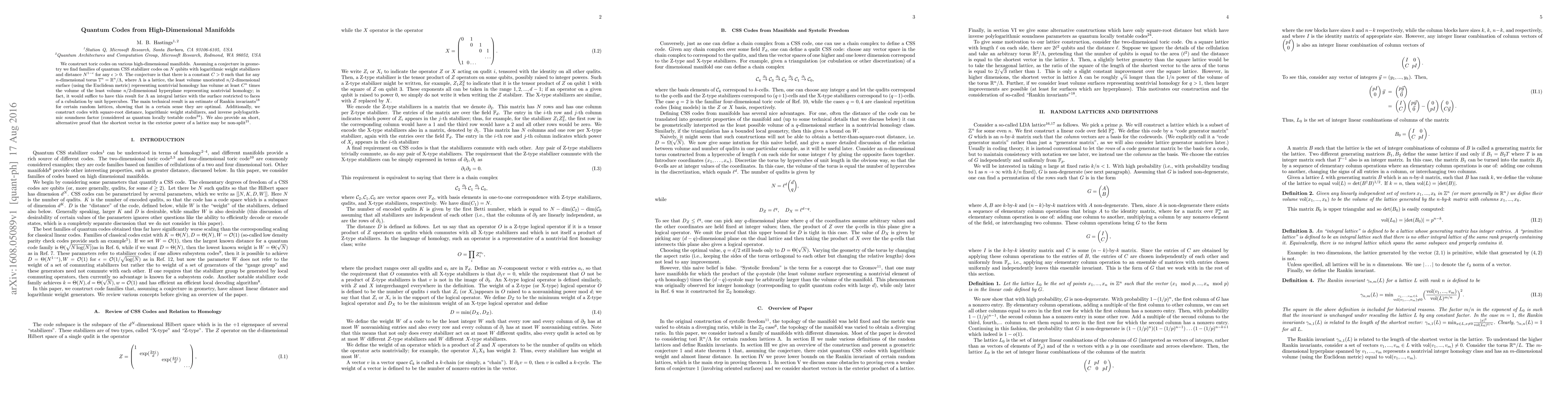 This paper constructs quantum CSS stabilizer codes on high-dimensional manifolds based on a geometric conjecture, achieving logarithmic weight stabilizers and distance $N^{1-\epsilon}$ for any $\epsilon > 0$. The conjecture posits a lower bound on the volume of certain minimal surfaces in lattices, and the authors provide an estimate of Rankin invariants to support this.