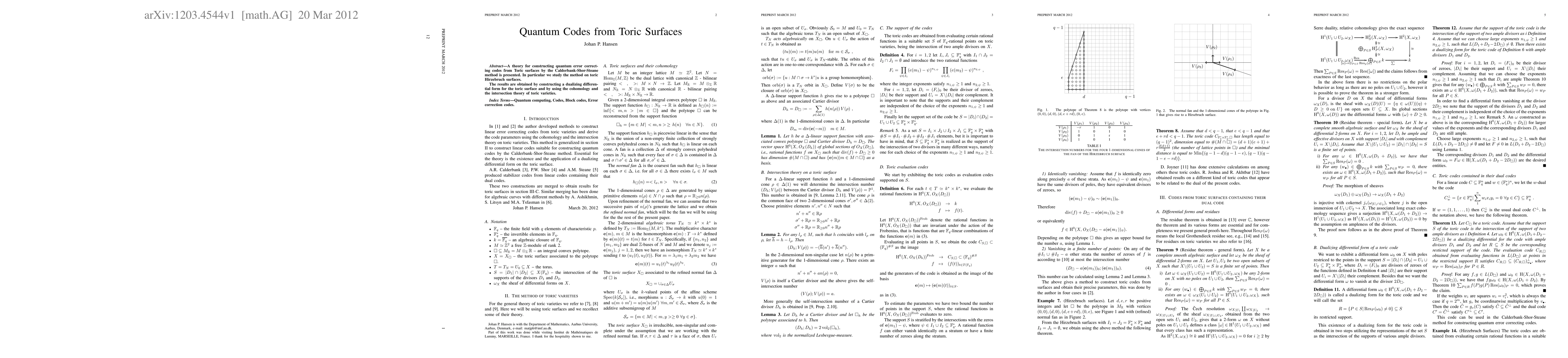 This paper presents a method for constructing quantum error correcting codes using Toric surfaces via the Calderbank-Shor-Steane approach, focusing on Hirzebruch surfaces. It merges earlier techniques for linear codes with the Calderbank-Shor-Steane stabilizer code construction, utilizing dualizing differential forms and toric cohomology.