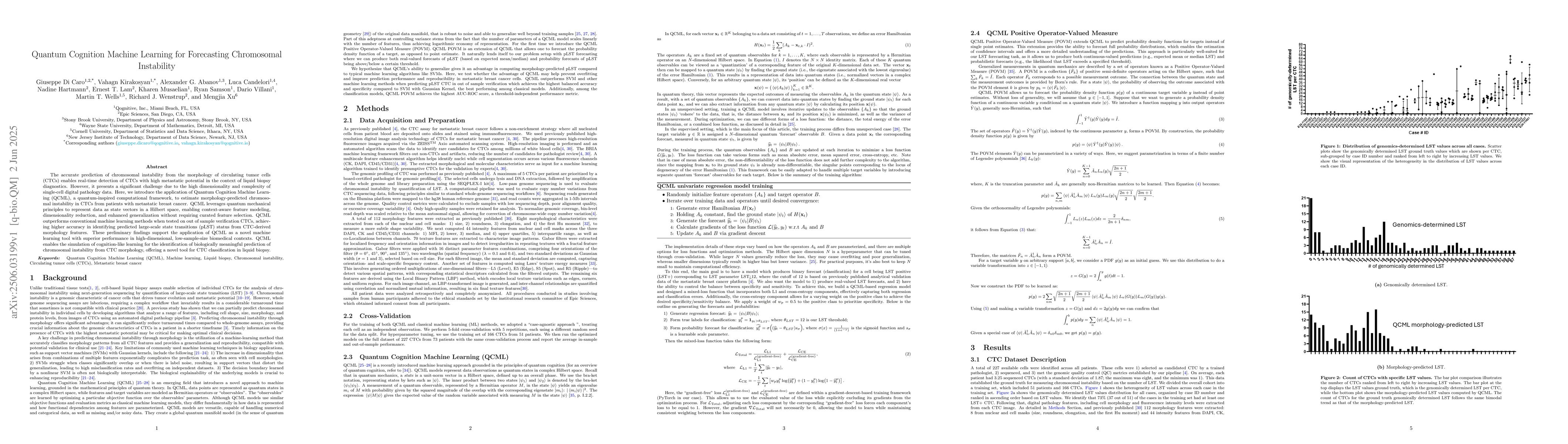 The research introduces Quantum Cognition Machine Learning (QCML), a quantum-inspired computational framework, to predict chromosomal instability in circulating tumor cells (CTCs) from single-cell digital pathology data. QCML uses quantum mechanical principles for context-aware feature modeling, dimensionality reduction, and enhanced generalization.