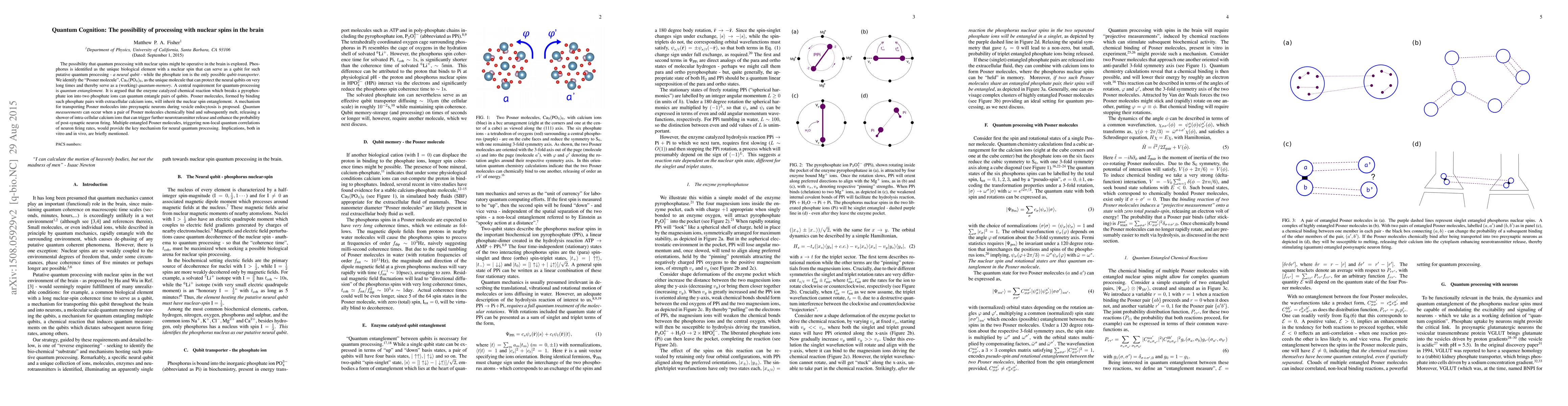 The possibility that quantum processing with nuclear spins might be operative in the brain is proposed and then explored. Phosphorus is identified as the unique biological element with a nuclear spin that can serve as a qubit for such putative quantum processing - a neural qubit - while the phosphate ion is the only possible qubit-transporter. We identify the "Posner molecule", $\text{Ca}_9 (\text{PO}_4)_6$, as the unique molecule that can protect the neural qubits on very long times and thereby serve as a (working) quantum-memory. A central requirement for quantum-processing is quantum entanglement. It is argued that the enzyme catalyzed chemical reaction which breaks a pyrophosphate ion into two phosphate ions can quantum entangle pairs of qubits. Posner molecules, formed by binding such phosphate pairs with extracellular calcium ions, will inherit the nuclear spin entanglement. A mechanism for transporting Posner molecules into presynaptic neurons during a "kiss and run" exocytosis, which releases neurotransmitters into the synaptic cleft, is proposed. Quantum measurements can occur when a pair of Posner molecules chemically bind and subsequently melt, releasing a shower of intra-cellular calcium ions that can trigger further neurotransmitter release and enhance the probability of post-synaptic neuron firing. Multiple entangled Posner molecules, triggering non-local quantum correlations of neuron firing rates, would provide the key mechanism for neural quantum processing. Implications, both in vitro and in vivo, are briefly mentioned.