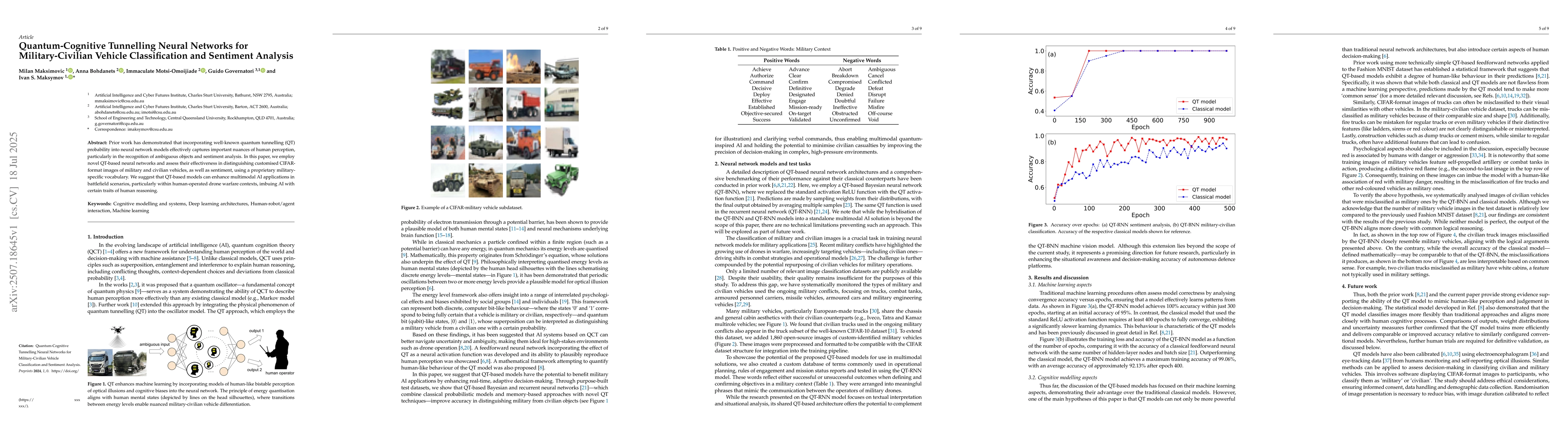 Prior work has demonstrated that incorporating well-known quantum tunnelling (QT) probability into neural network models effectively captures important nuances of human perception, particularly in the recognition of ambiguous objects and sentiment analysis. In this paper, we employ novel QT-based neural networks and assess their effectiveness in distinguishing customised CIFAR-format images of military and civilian vehicles, as well as sentiment, using a proprietary military-specific vocabulary. We suggest that QT-based models can enhance multimodal AI applications in battlefield scenarios, particularly within human-operated drone warfare contexts, imbuing AI with certain traits of human reasoning.