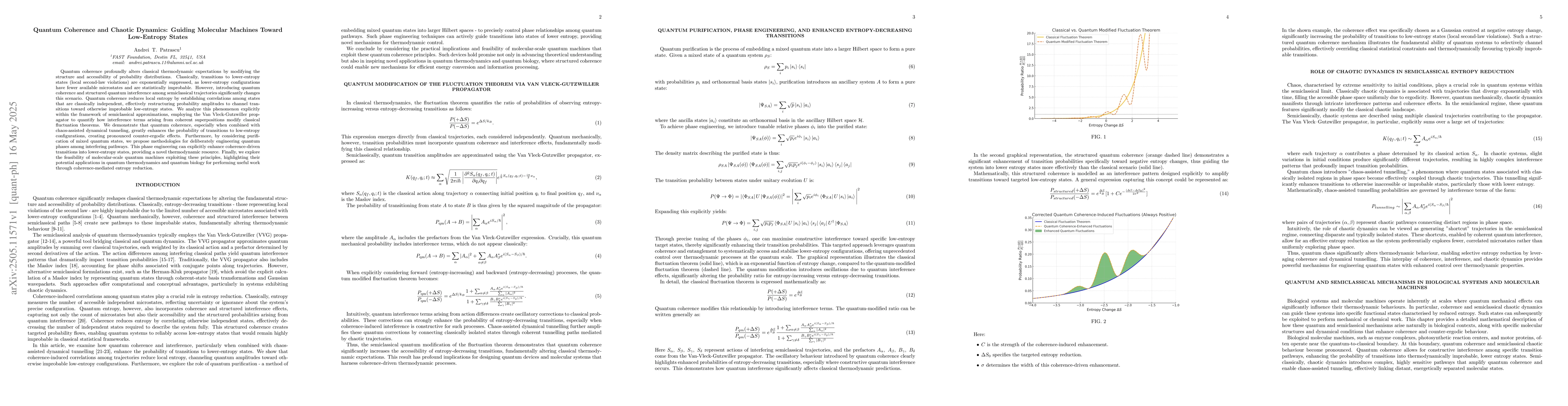 The paper presents a detailed analysis of how quantum coherence and chaotic dynamics can guide molecular machines toward low-entropy states, restructuring probability amplitudes and enhancing transitions to otherwise improbable configurations.