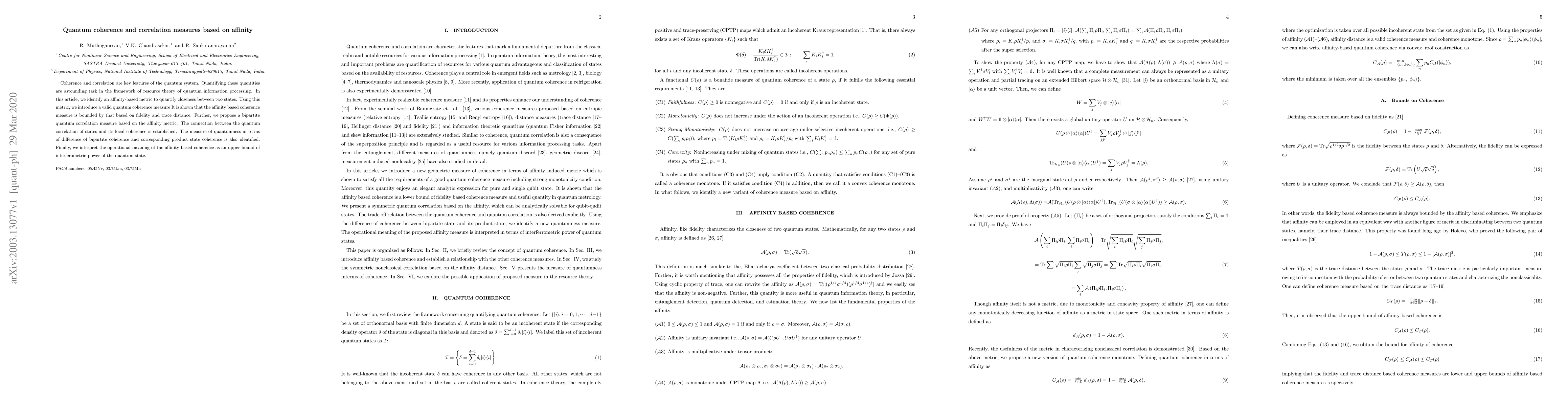 This paper introduces an affinity-based metric to quantify quantum coherence and correlation. It proposes a coherence measure bounded by fidelity and trace distance, and a correlation measure linking quantumness to local coherence, with operational implications for interferometric power.