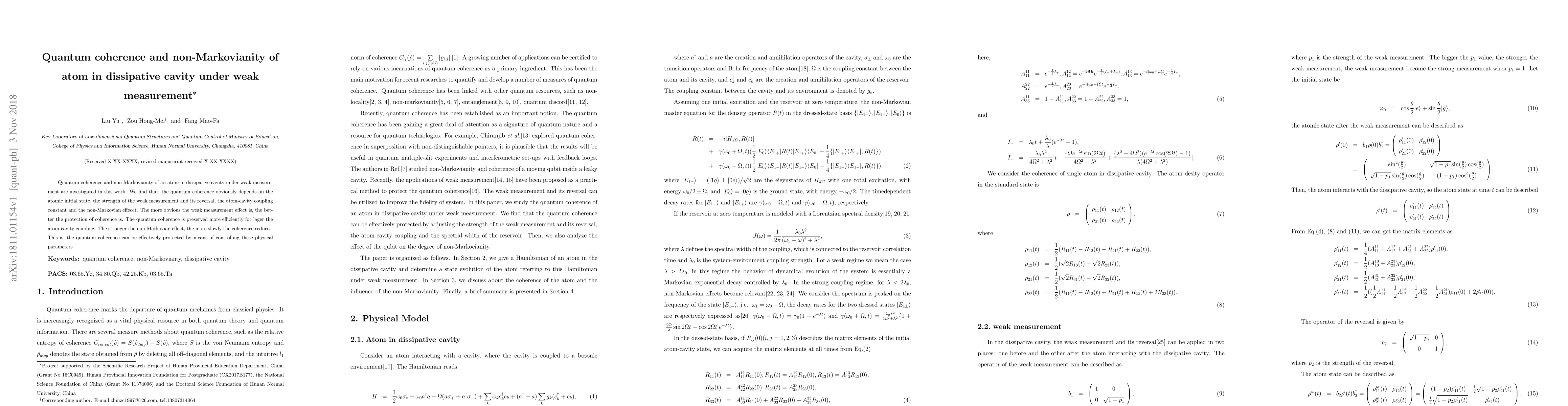 This paper investigates how quantum coherence and non-Markovianity in an atom within a dissipative cavity are influenced by weak measurement, atomic initial state, and coupling strength. It finds that stronger weak measurement and higher atom-cavity coupling preserve coherence better, while stronger non-Markovian effects slow coherence reduction.